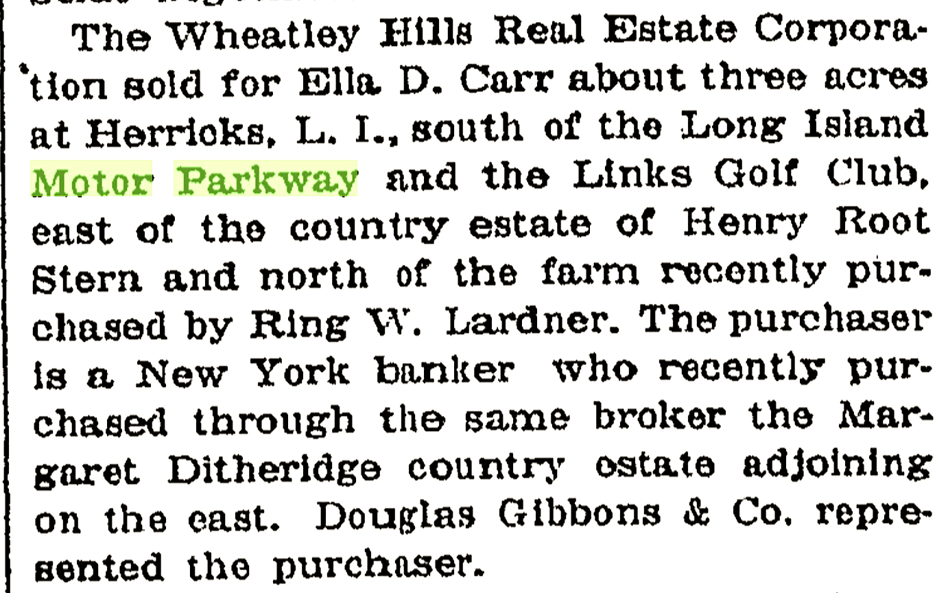 Three acres sold in Herricks near the Motor Parkway and the Links Golf Club. (New York Evening Post Feb. 3, 1926)