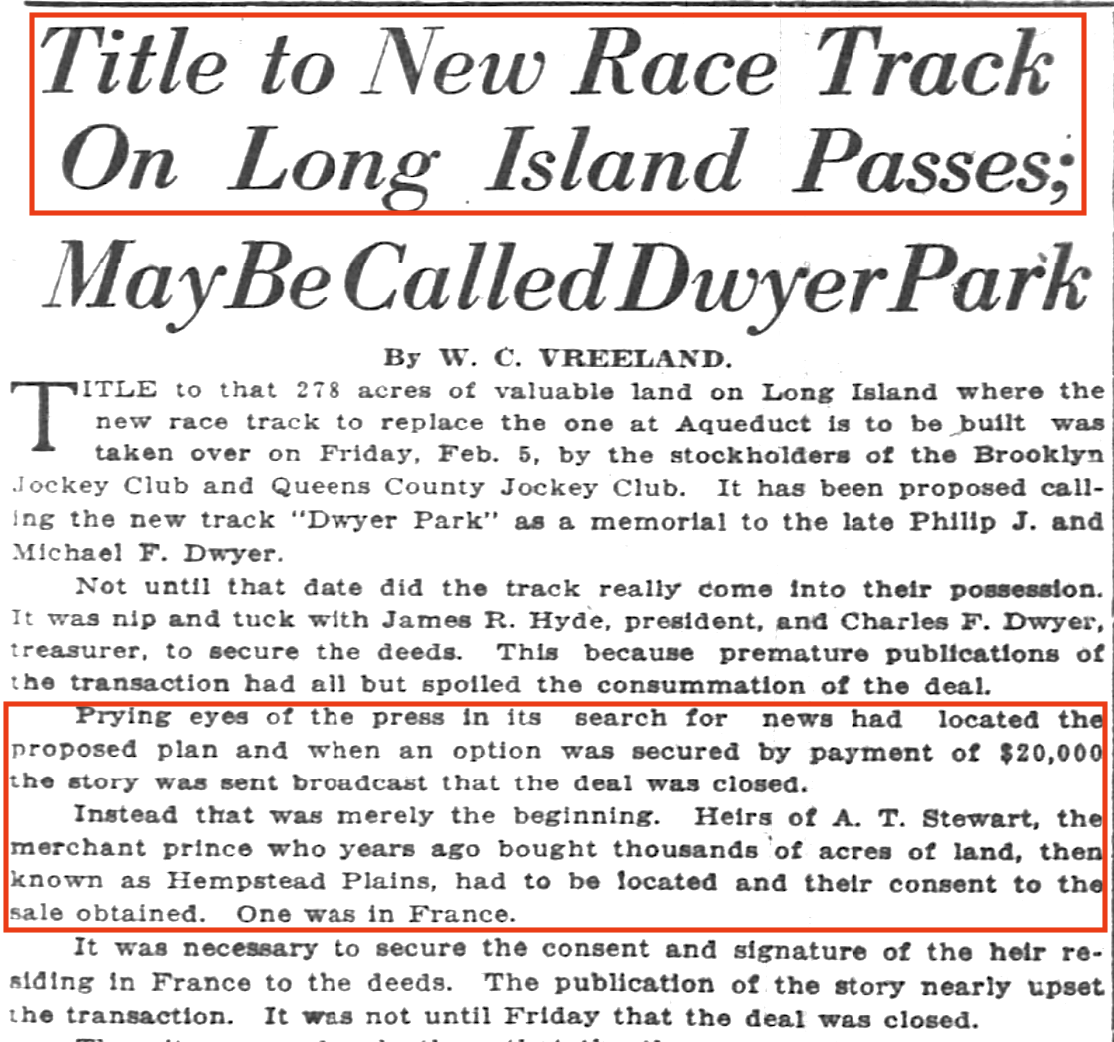 The sale only became finalized when the hiers of A.T. Stewart "the merchant prince" were located and their consent was given as the property was part of their large holdings in the Hempstead Plains. (Brooklyn Eagle Feb. 7, 1926)