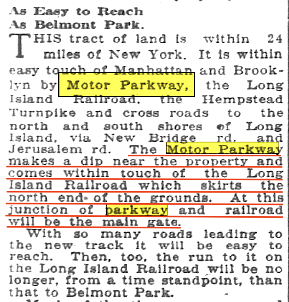 The man gate of the track was to be at the juncture of the Motor Parkway and the LIRR tracks on the north side of the property. (Brooklyn Eagle Feb. 7, 1926)