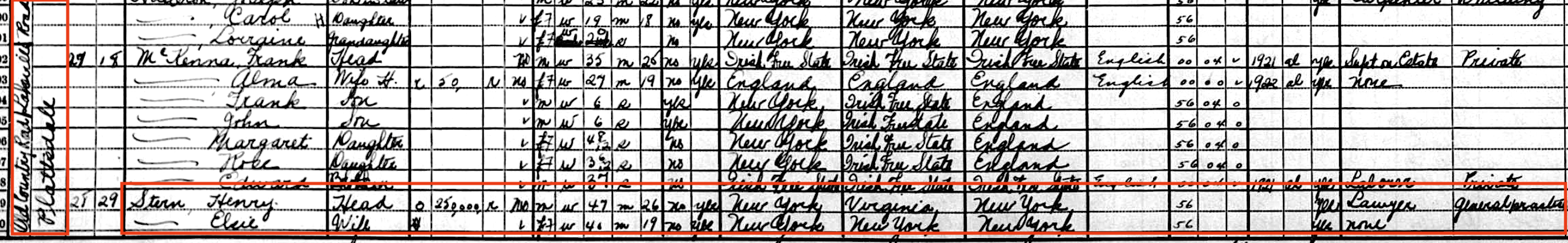 This 1940 census record shows Stern, his wife and several servants living on 67th Street in Manhattan. I believe the property in Herricks was his country estate. (U.S. Census, 1940)