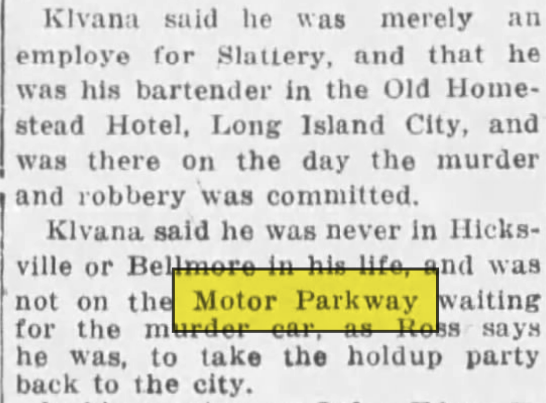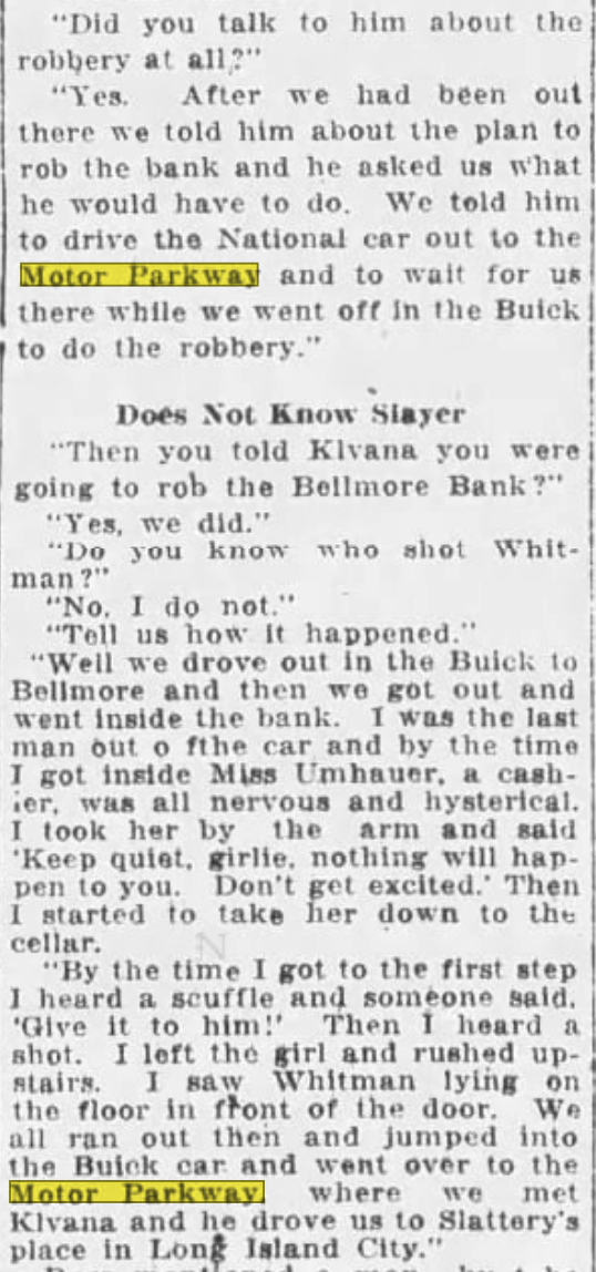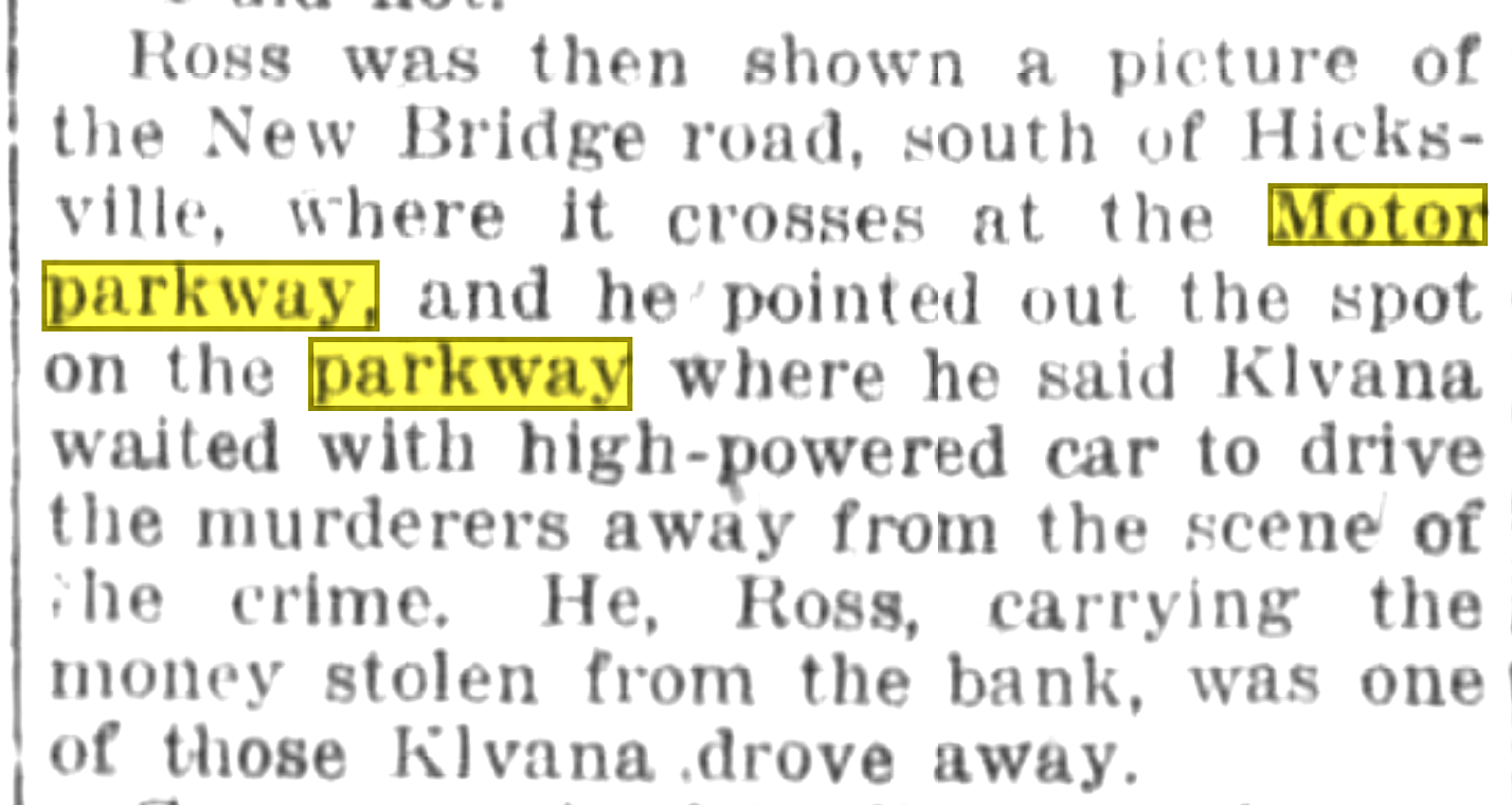 Testimony indicated the Motor Parkway was the gang's meeting place after the robbery. (Brooklyn Daily Times Feb. 3, 1926)