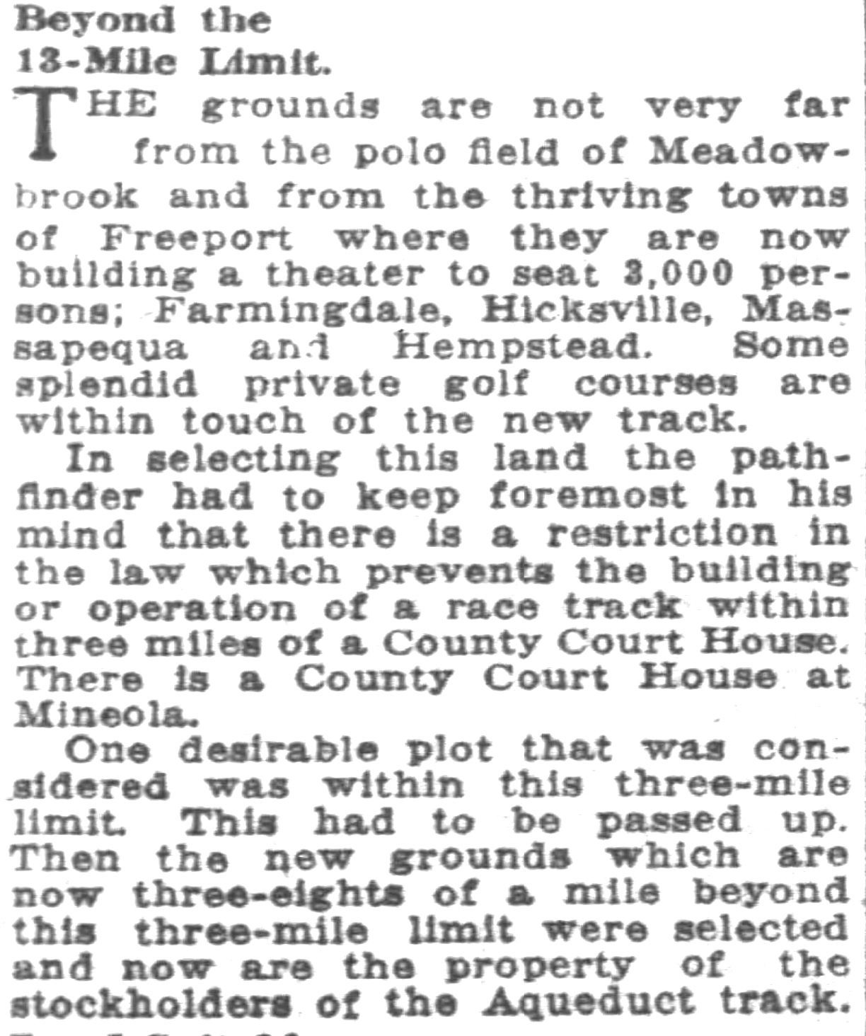 As reported in the January, 1926 look back, a racetrack was proposed in today's Levittown, just south of the Motor Parkway between Jerusalem Avenue and Bethpage (Hempstead) Turnpike. It would have replaced Aqueduct Raceway in Brooklyn. (Brooklyn Eagle Feb. 7, 1926).