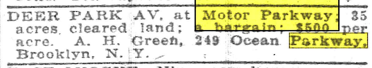 Thirty-five acres for sale near the Parkway for $500 an acre! (Brooklyn Eagle Feb. 14, 1926)