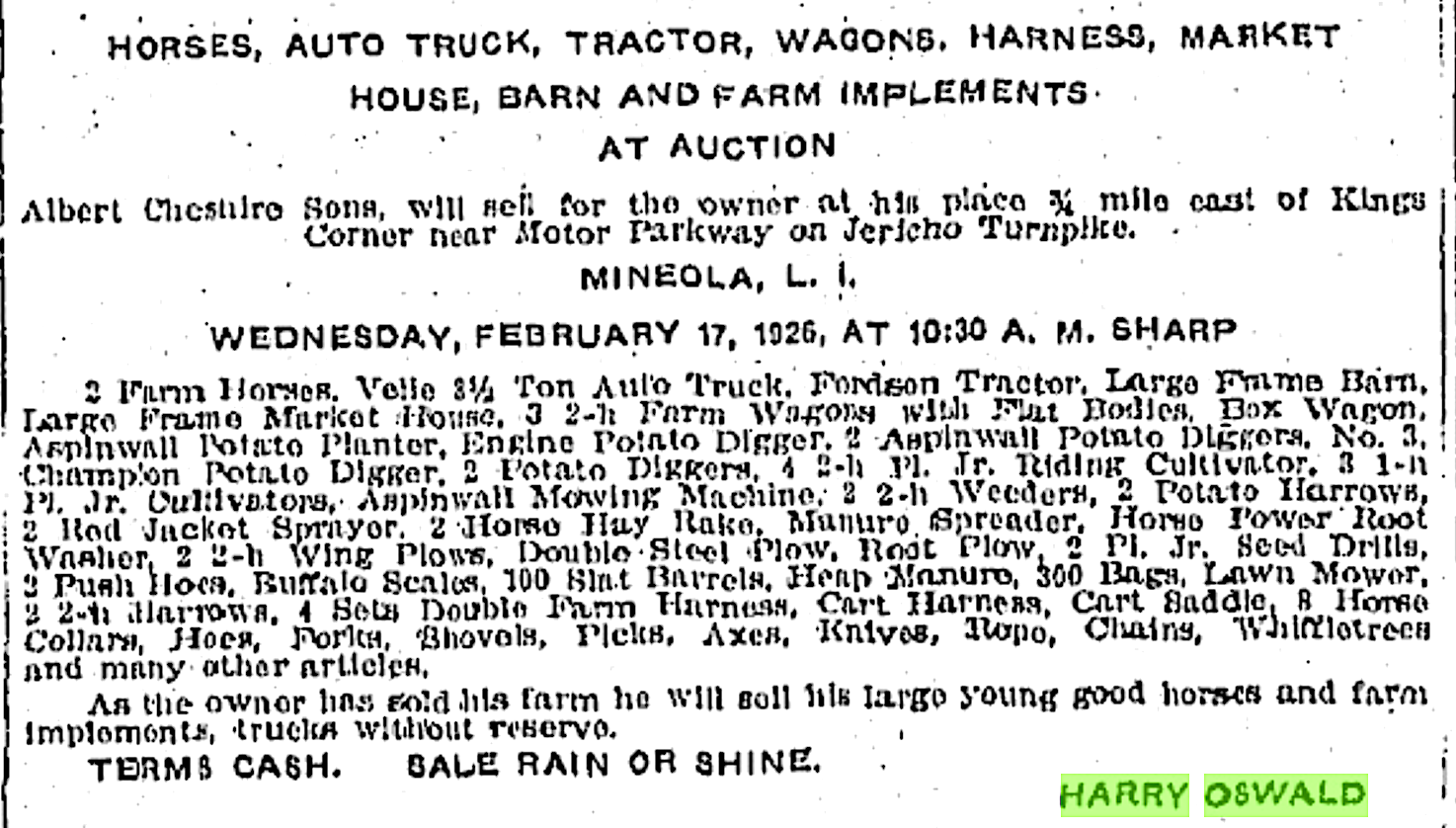 A previous ad for this auction near the Motor Parkway appeared again in February. Note the auto-truck for sale! (The Long-Islander Feb. 5, 1926)