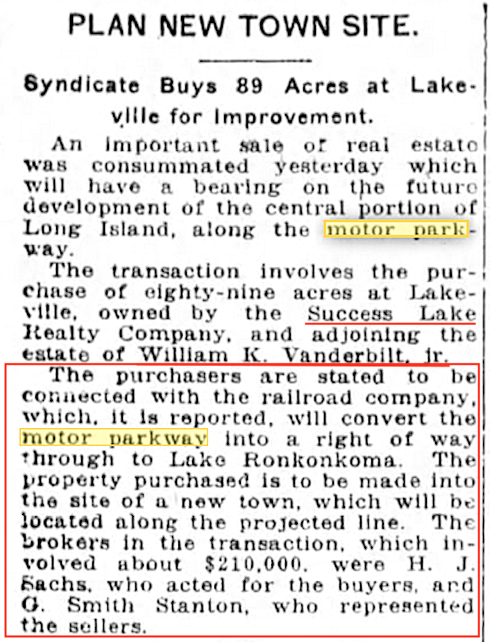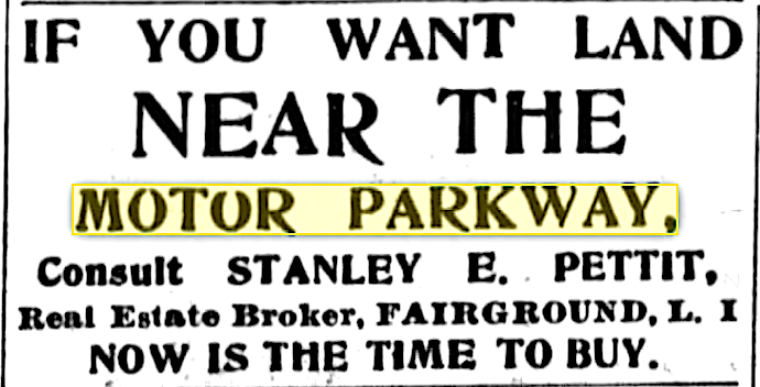 Buy land now! The Pettit Real Estate brokerage was located in Fairground, LI. which was north of the Motor Parkway. (Mar. 30, 1907)