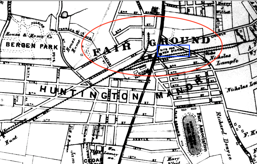 The area got its name from the nearby fairground (containing the Huntington Race Track) and was renamed Huntington Station around 1912 probably to reflect the new LIRR station that was erected. However, "Fairground Avenue" remains as a major thoroughfare in the area.