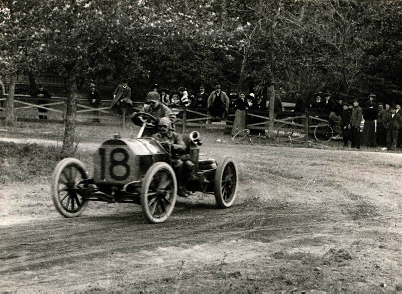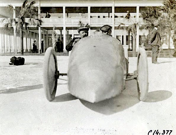 The illustration depicts Louis Ross in his tear-drop shaped Stanley Steamer, however Ross did not race in the 1904 VCR, but at Ormand Beach ("The Dawn of Speed" Beverly Kae Kimes, 1987)