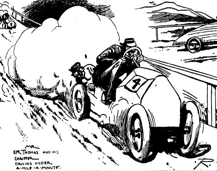 "Mr. E. R. Thomas and his chauffer driving under a-mile-a minute".