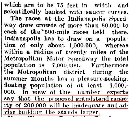Some thought due to the large population around the Speedway's location the 200,000 seating capacity would be inadequate.