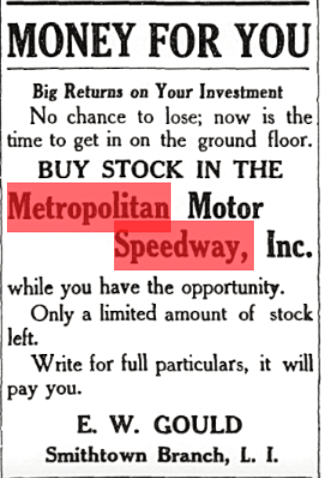 Interesting that ads promoting the stock investment were placed in Long Island publications. Possibly even at this time (July, 1912) plans were being made to move the speedway from New Jersey to Long Island. Or possibly to obtain the support of other Motor Parkway personalities. (South Side Signal Jul. 12, 1912)