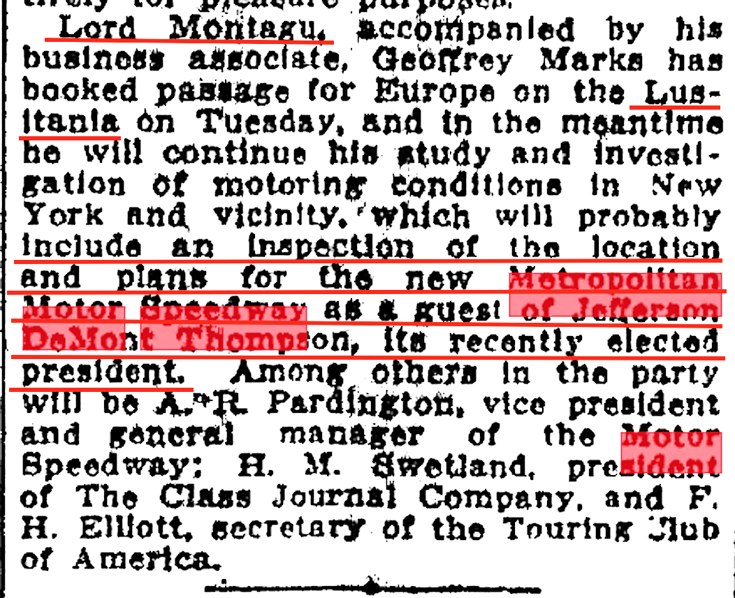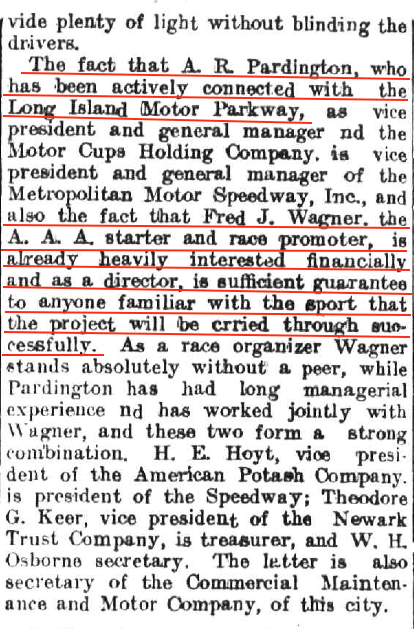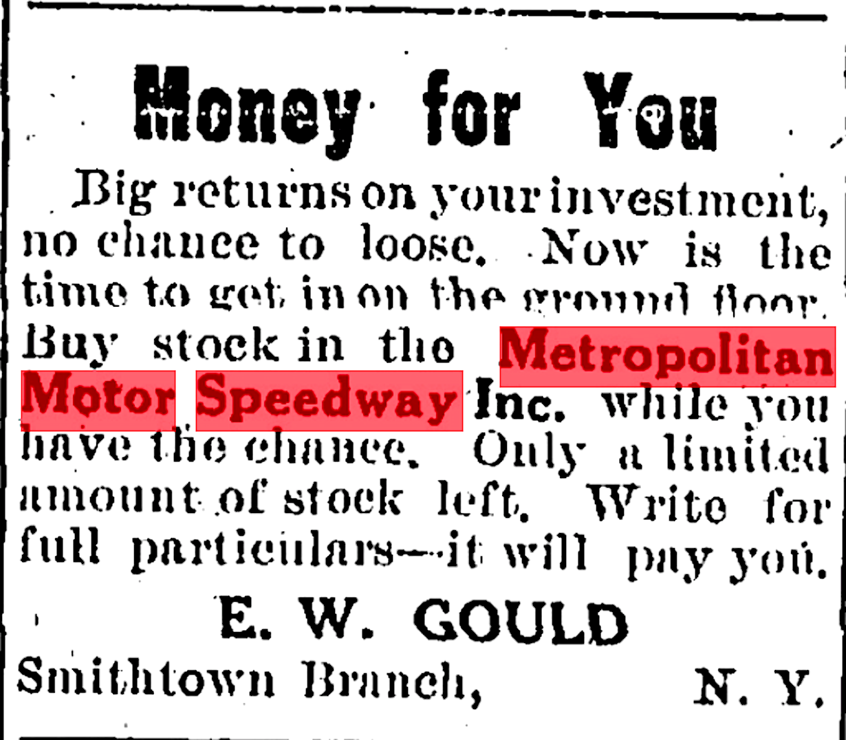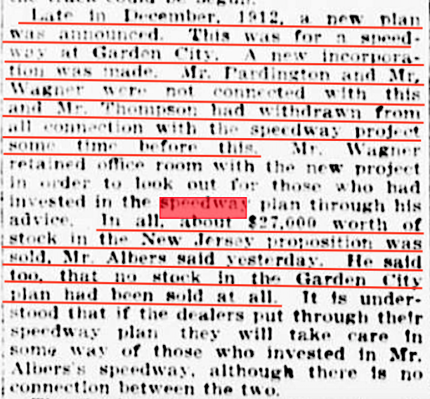 The plan was abandoned with only $27,000 in stock issued and Pardington, Wagner and Thompson pulling out. The new plan to build the Motordome on Long Island also fizzled out as detailed in my post of May 28, 2022. (The Sun Apr. 3, 1913)