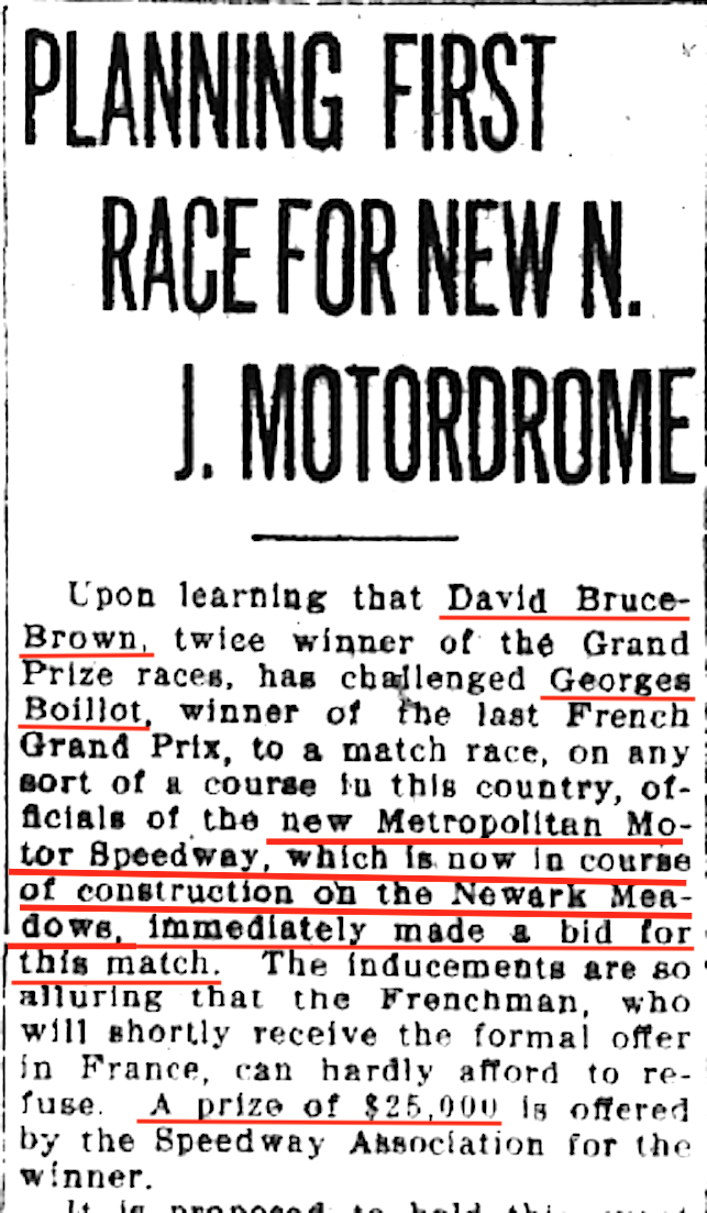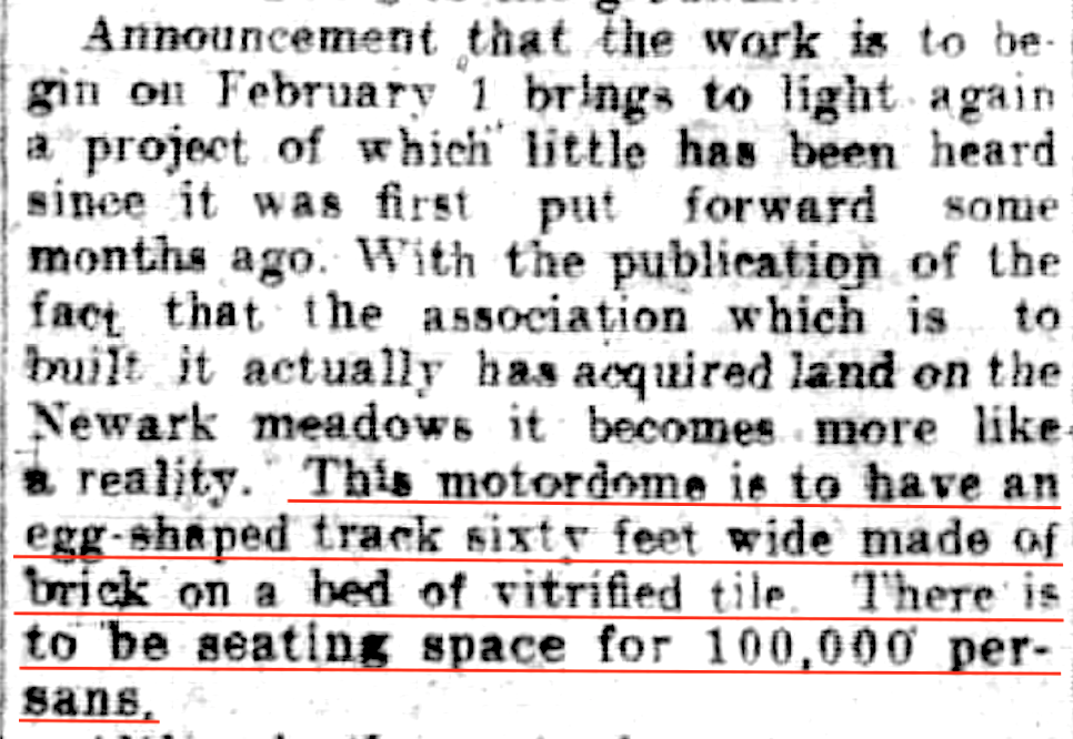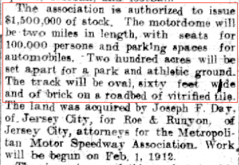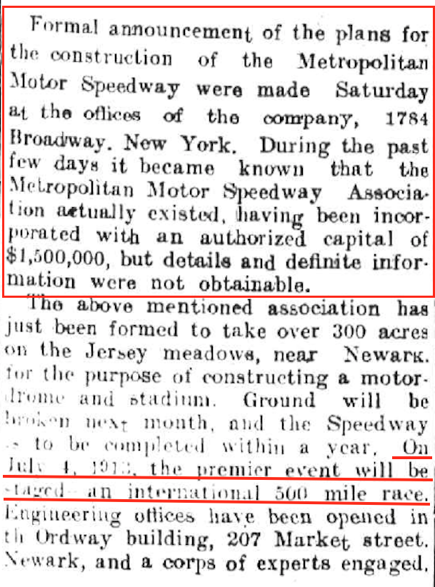 A previous post mentioned an aborted plan in 1912 to develop a New Jersey speedway and ultimately move it to Long Island. This post will detail a plan by the Metropolitan Motor Speedway to construct a Speedway in the marshes of New Jersey and its goal of raising over $1.5 million.