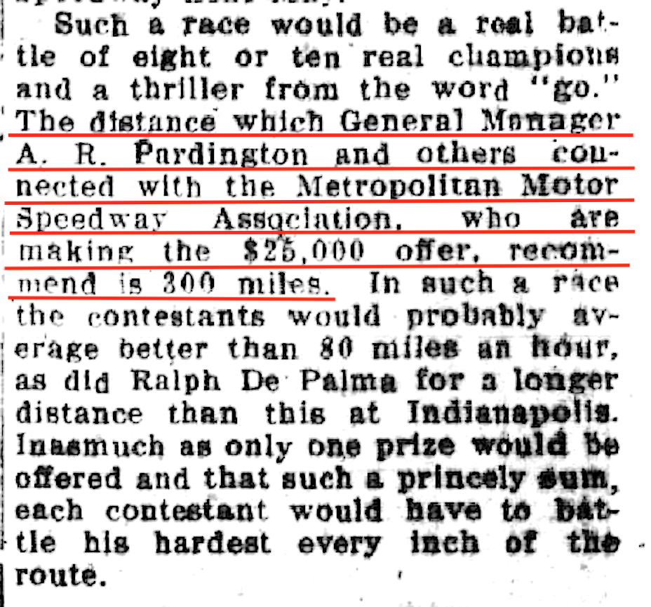 The race was proposed to be 300 miles by A. R. Pardington and other officials.