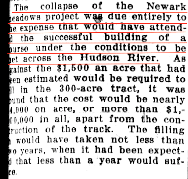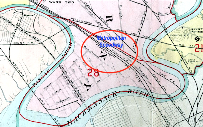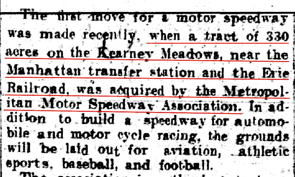 Property was acquired to build the speedway in what was known then as the "Kearny Meadows" or the "Newark Meadows". Much of the area was (and still is) marshland. (The Daily Home News Jan. 9, 1912)
