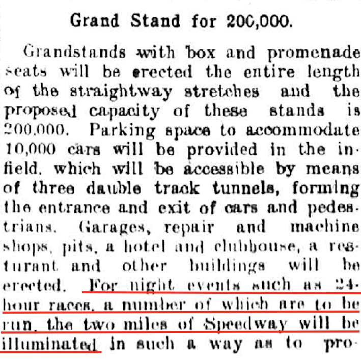 The seating capacity was raised to 200,000; lighting for evening events or 24 hour racing was planned.