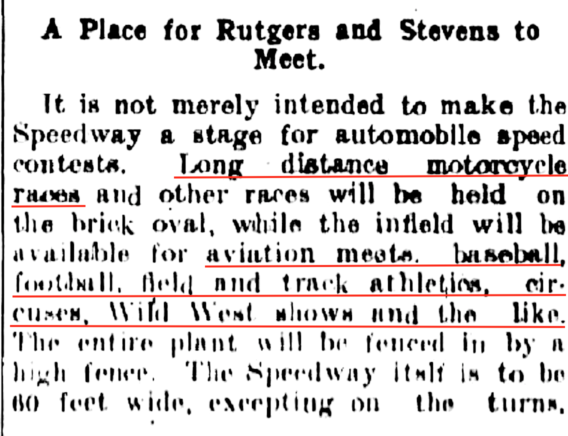 Besides auto racing, the Speedway's 200 (other sources say 300) acres would provide space for various other athletic events.