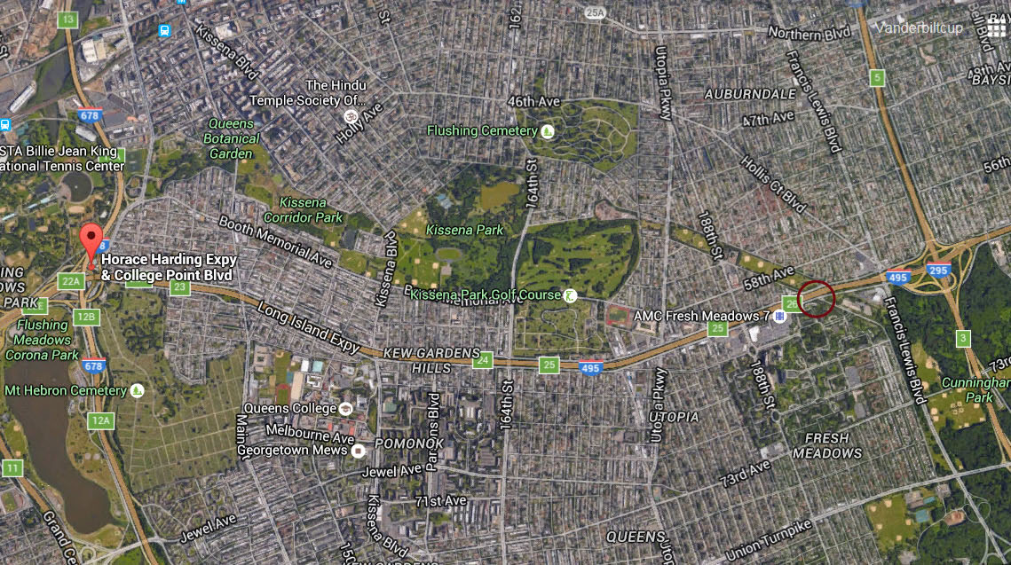Location of the sign in relation to the terminus of the Long Island Motor Parkway in Fresh Meadows.