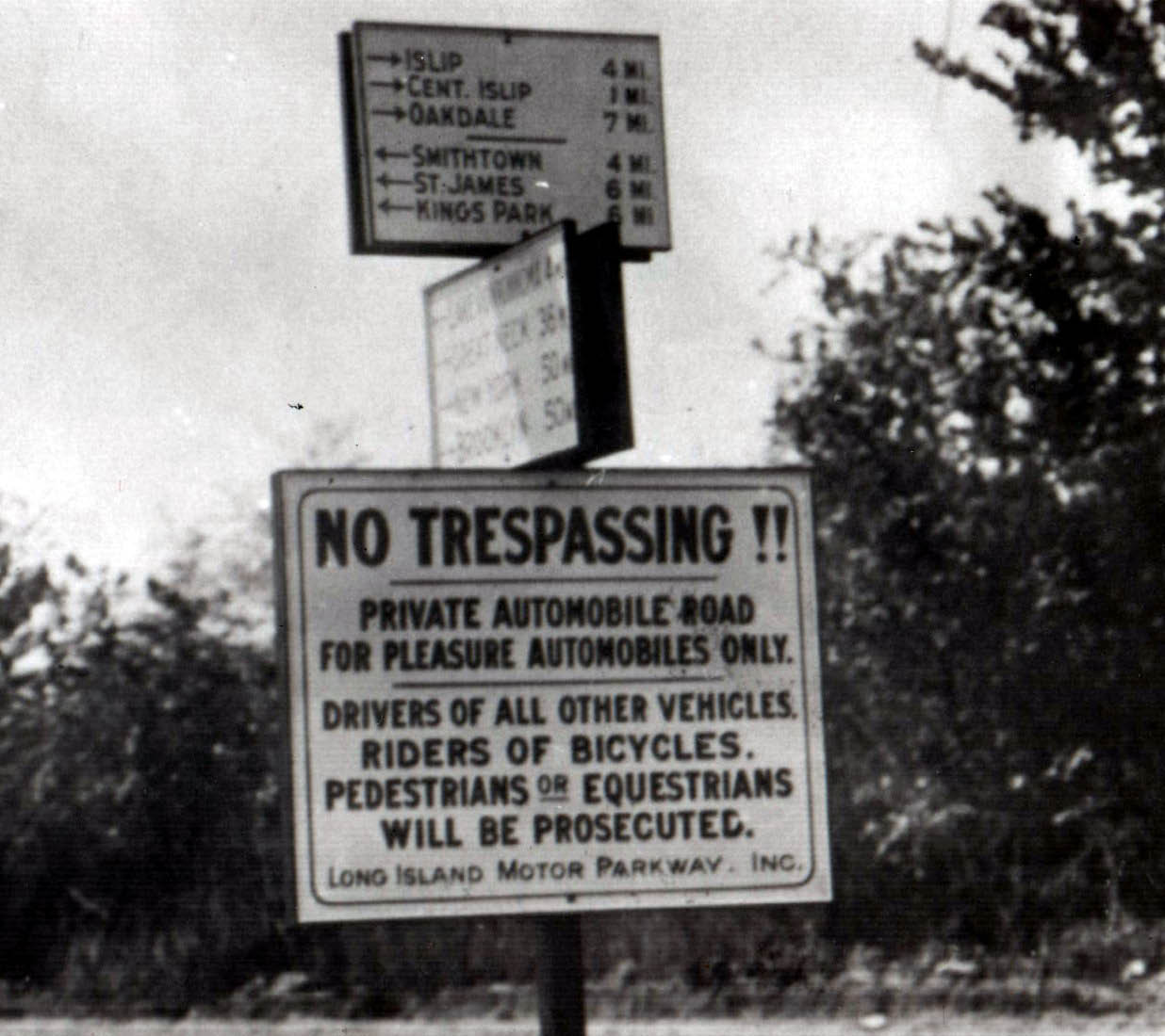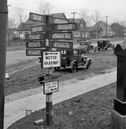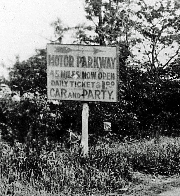 The sign at Springfield Boulevard in Queens read:"MOTOR PARKWAY To all points on Long Island. One Way Ticket Car and Party $1.00". Courtesy of Bill Schwartzberg.