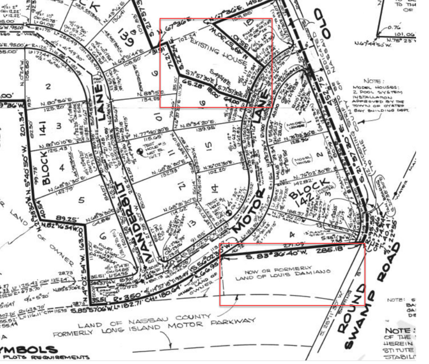Hi Howard, I was on your Motor Parkway site the other day and noticed this image by Frank Femenias on your site. It denotes that the Bethpage Lodge was on the south side of Motor Lane and emptied out onto the southwest corner of Round Swamp and Old Bethpage Roads. However, on this map of the plans of Greentree Acres, it shows that although Louis Damiano owned land near the lodge at the time, it didn't say there was an existing house there, unlike on the north side Motor Lane near Old Bethpage Road. My question is, is there any concrete proof that the lodge really was where most people think it was? Or is this "existing house" just another existing house?