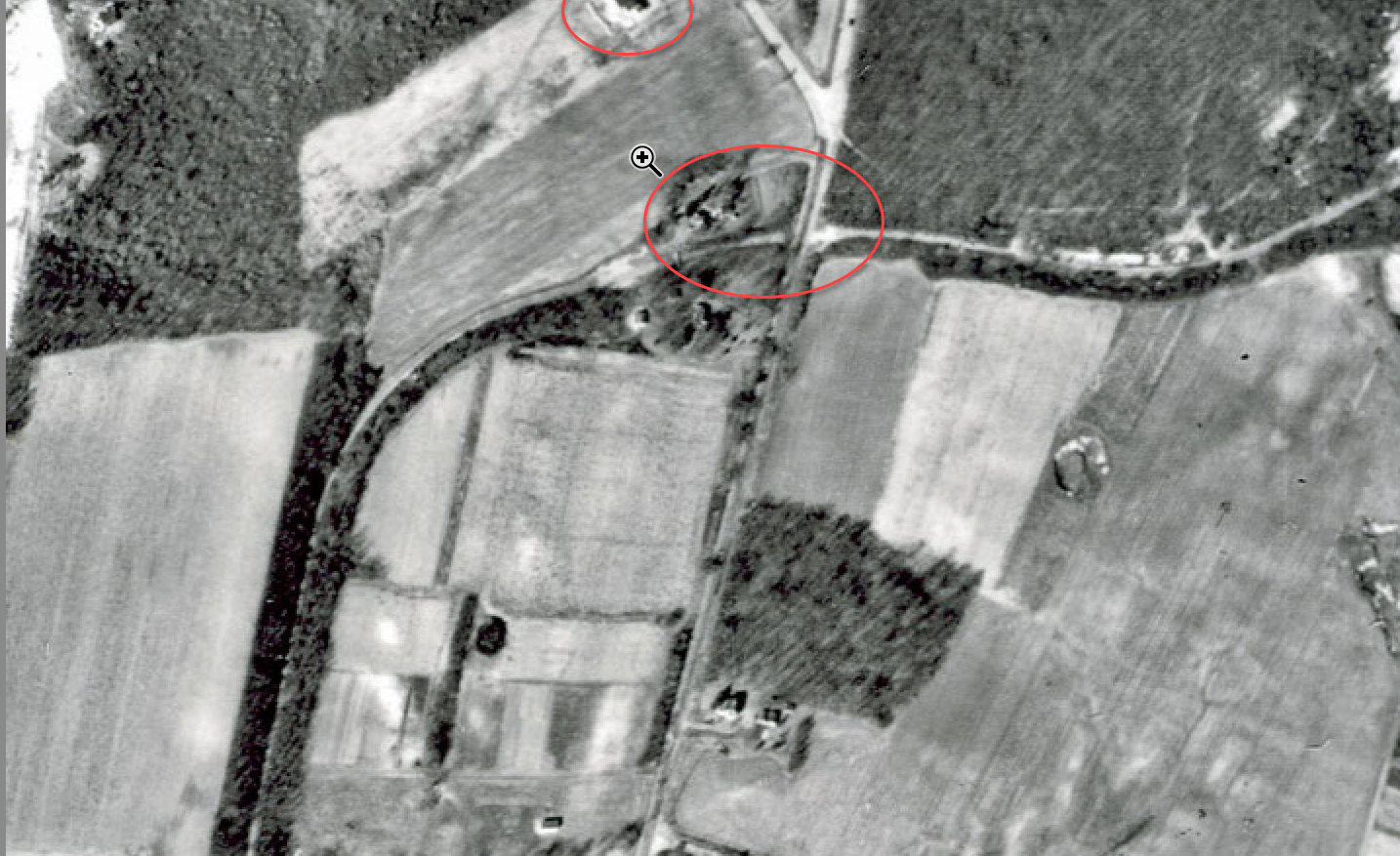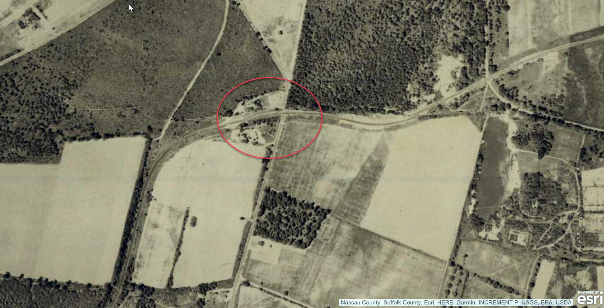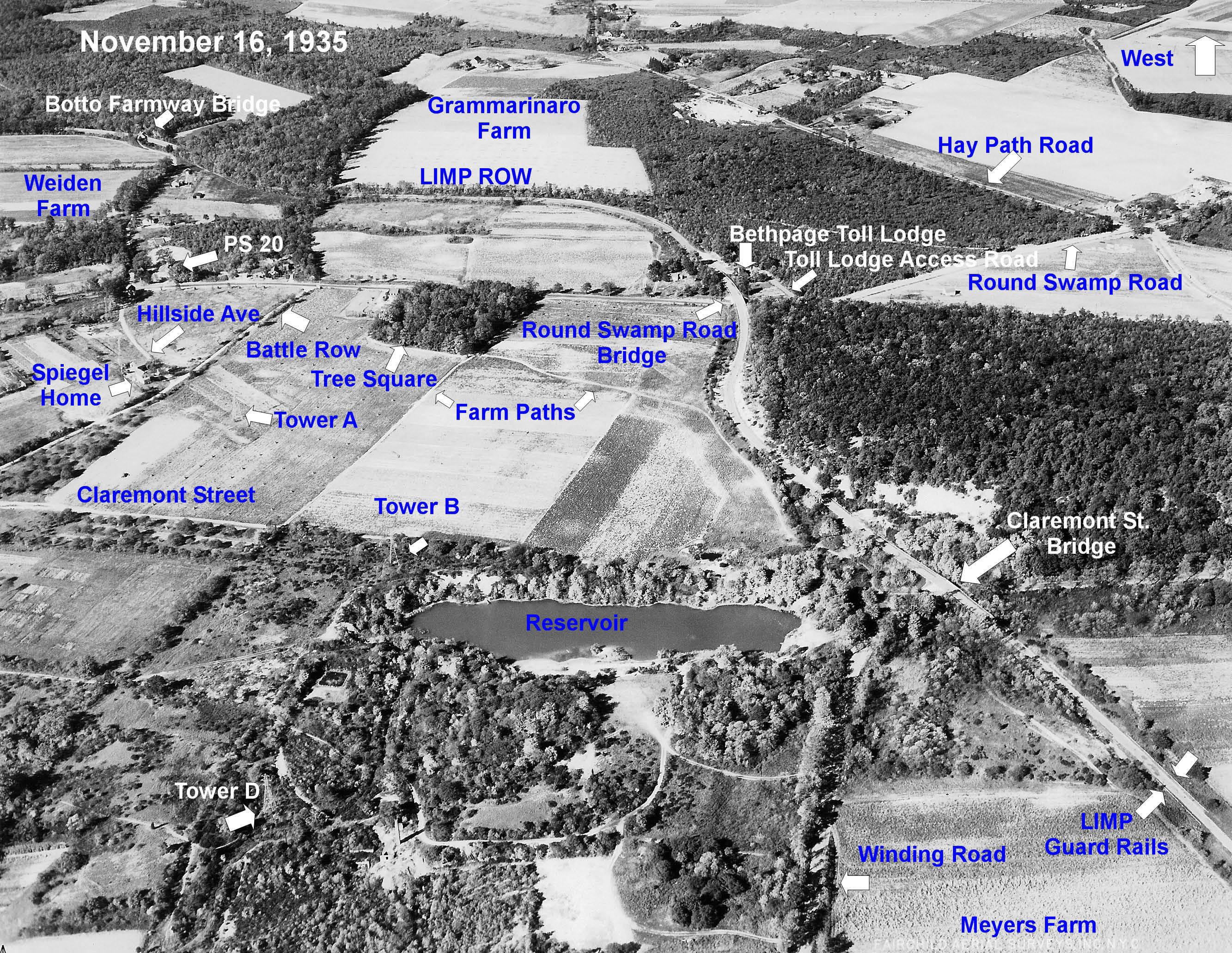 I’ll stay out of this except to question the marked aerial at the top. The horizontal (W-E) row of heavy shrubs just north of the Plainview maintenance building driveway-cum-parking-area marks a tall berm that was still there last I looked. The lodge driveway would not have run up on the berm. I can’t find my oldest pic of the berm but here’s one ca. 2002 looking NNW (pre-parking-area). [See also 17