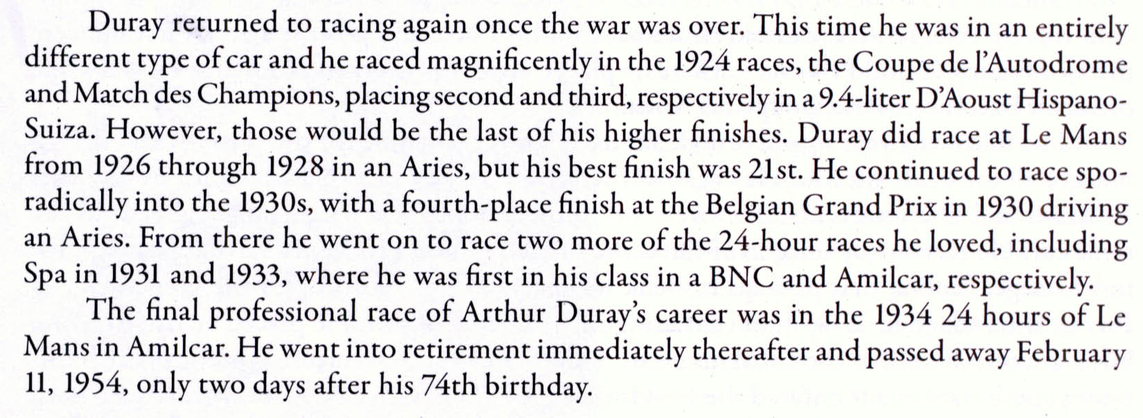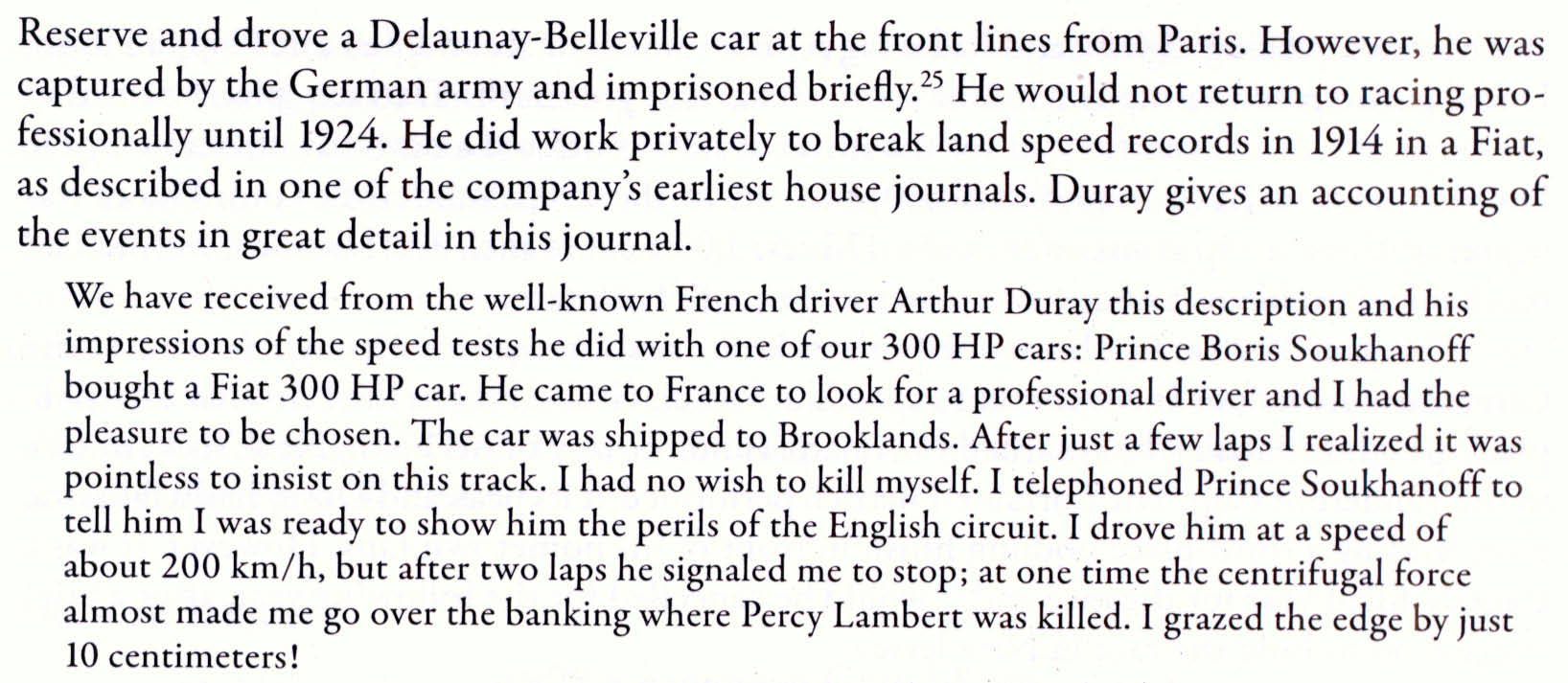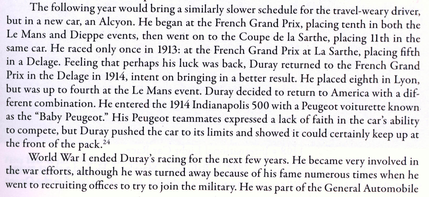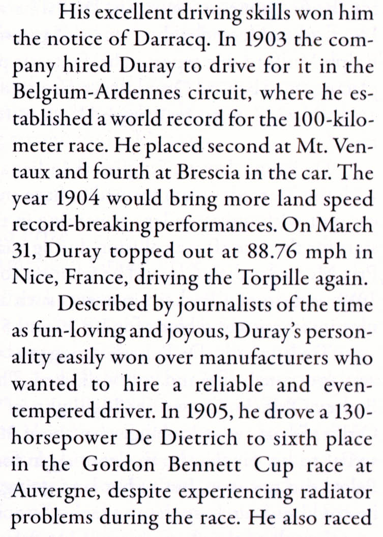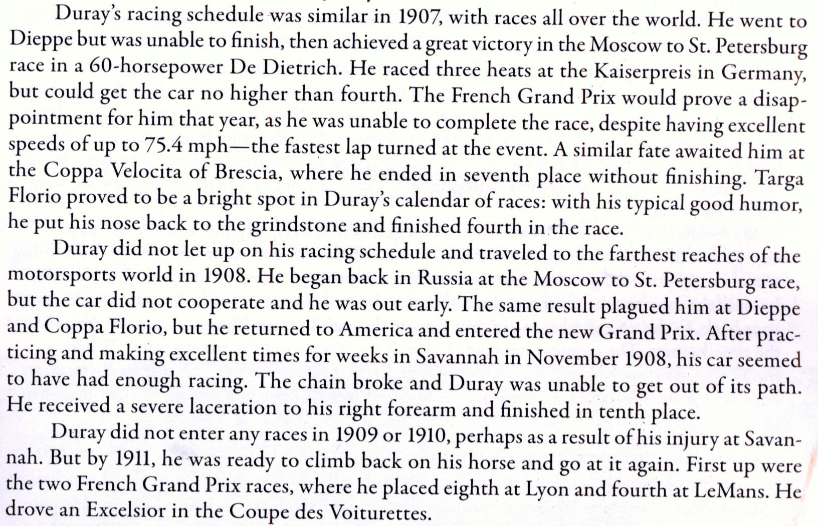 A spare tire and rim strapped to the back of the #18 Lorraine-Dietrich broke loose during the 1906 Vanderbilt Cup Race and began to thrash the gas tank. Riding mechanician Franville clutched the heavy mounted tire and lost his balance. Just as the car skidded through the turn, Duray handled the tight corner with one hand on the wheel while rescuing his assistant with his left arm.