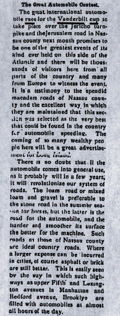 The article expressed the pending excitement of Long Islanders to the upcoming race. "The great international automobile race for the Vanderbilt cup to take place over the Jericho turnpike and the Jerusalem road in Nassau county next month promises to be one of the greatest events of its kind ever held on this side of the Atlantic and there will be thousands of visitors here from all parts of the country and many from Europe to witness the event...The coming of so many wealthy people will be a great advertisement for Long Island."