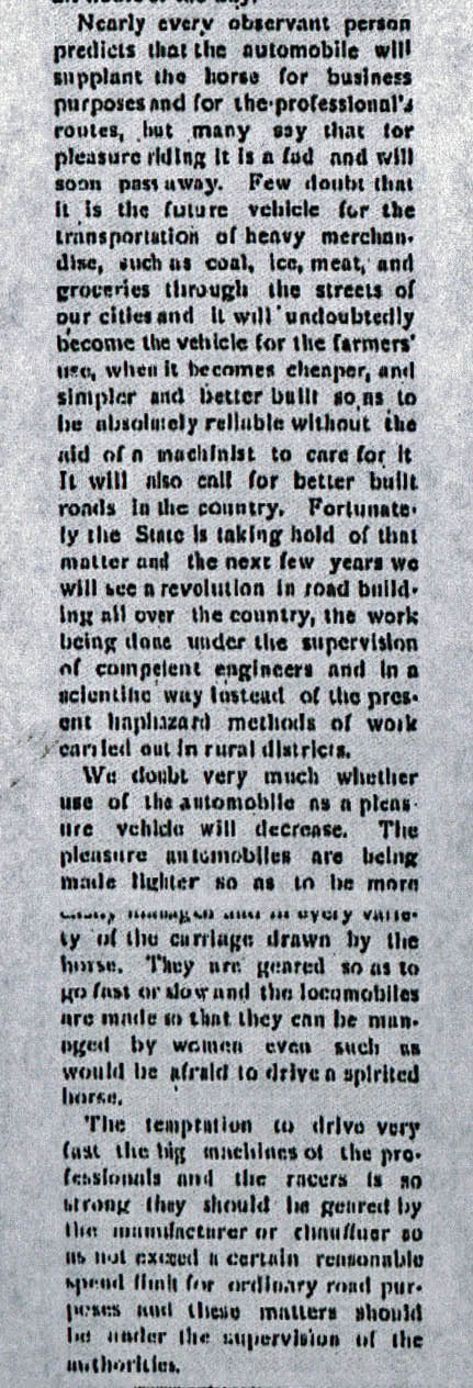 The reporter also made these forecasts of the future of automobile and roads. "Nearly every observant person predicts that the automobile will supplant the horse for business purposes and for the professional's routes, but many say that for pleasure riding it is a fad and will soon pass away. Few doubt that is the future vehicle for the transportation of heavy merchandise, such as coal, ice, meat and groceries through the streets of our cities and it will undoubtedly become the vehicle for the farmers' use, when it becomes cheaper, and simpler and better built so as to be absolutely reliable without the aid of a machinist to call for it. It will also call for better built roads in the country...We doubt very much whether use of the automobile as a pleasure vehicle will decrease."