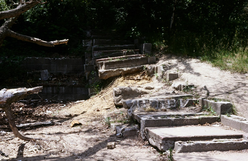 The 2 curved pathways meet into 1 short pathway. After this short pathway, the 9 steps are quite clear in the last comparison photo. And then a flat pathway continues on. Not too confuse anyone ( counting myself ), it seems like Ron’s 4th photo ( crumbling steps ) is/was a 2nd stairway that immediately led to the shoreline. It’s not too hard to imagine these crumbling steps to be of cinderblock construction filled in with cement/concrete mix, and then smoothed over with the mix. Maybe these steps are not original from the operational years? A straight path right to the lake continuing after the 9 steps could’ve been utilized as a boat launch? As Harold was saying, the path was removed by the area residents. And perhaps the steps in Ron’s 4th photo were installed afterwards to make it easier to access the shoreline. I’ve walked along the N/S of the lake, but not in this area. There’s quite a drop from the land to the shoreline I remember.