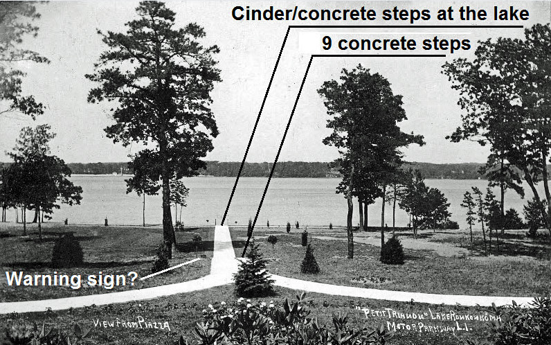 The steps in the 1981 photo are indeed the same steps that were on the walkway behind the trianon. After coming down those steps you would follow the path down to the wall that ran along the shoreline,topped with bricks, that had a staircase down to the beach at each end of the wall. The 2016 photo shows the remains of the south end of that wall along the shoreline, and the remains of the steps that were once there.The lower stairs to the beach were constucted of cinder blocks covered by concrete. The upper set of stairs were constructed out of concrete. The ancient post marking the Southern boundary of the property is still in place just south of the Lower step remains.