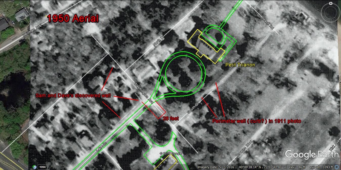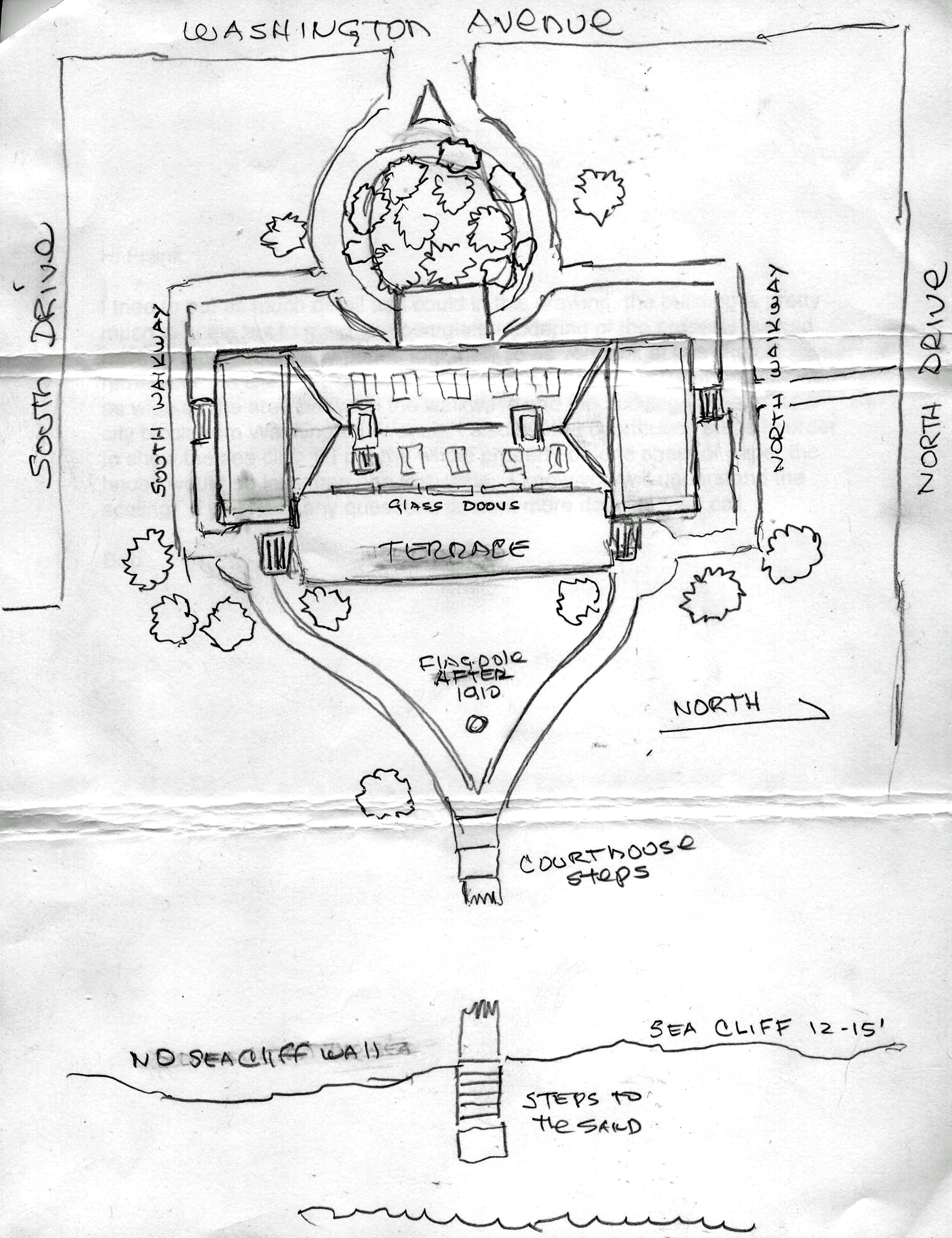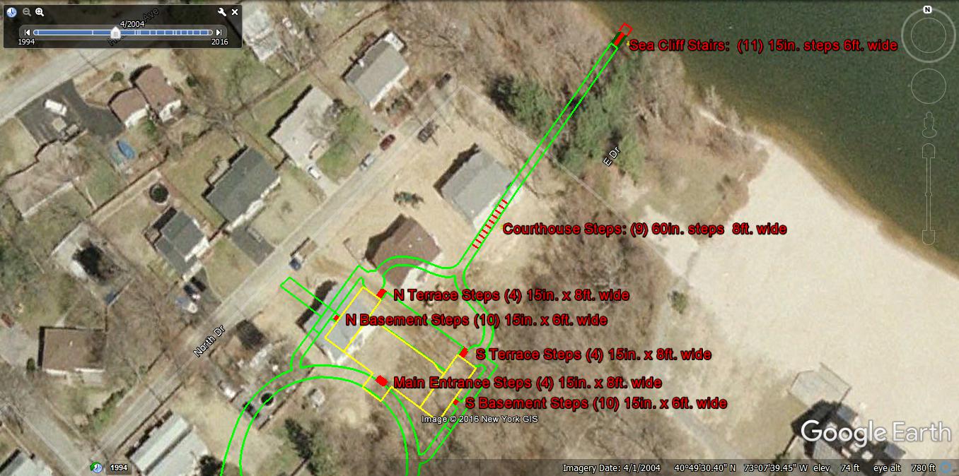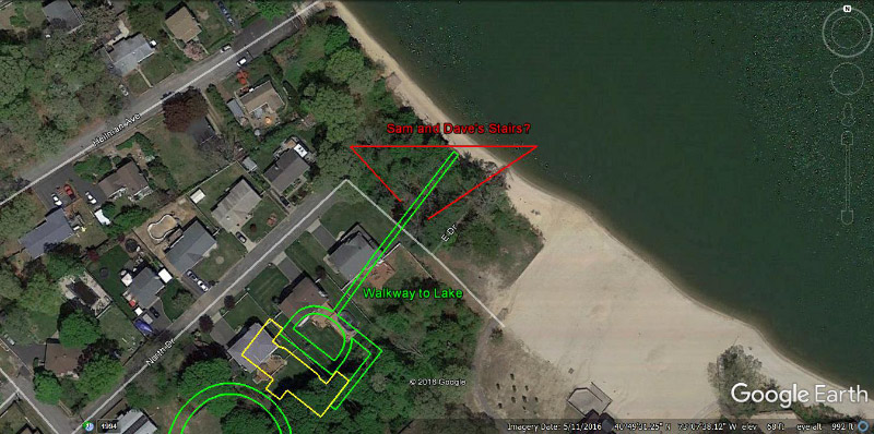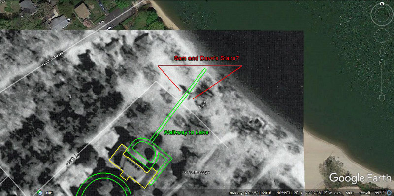 After studying Franks overlay on the current Google map the location where he shows the walkway is EXACTLY where I took my picture of what remains, right behind the easternmost house that is just south of North Drive. Now you might be correct, it might not have been “steps” in this exact location of my picture (Ron’s picture of the steps was right next to the Petit, further away from the water) which is very close to the water but clearly there was a retaining wall here (and is still here) and perhaps this was just part of the cement sloped path leading to the water at this spot. Perhaps my picture of the concrete on the sand is part of this walkway?