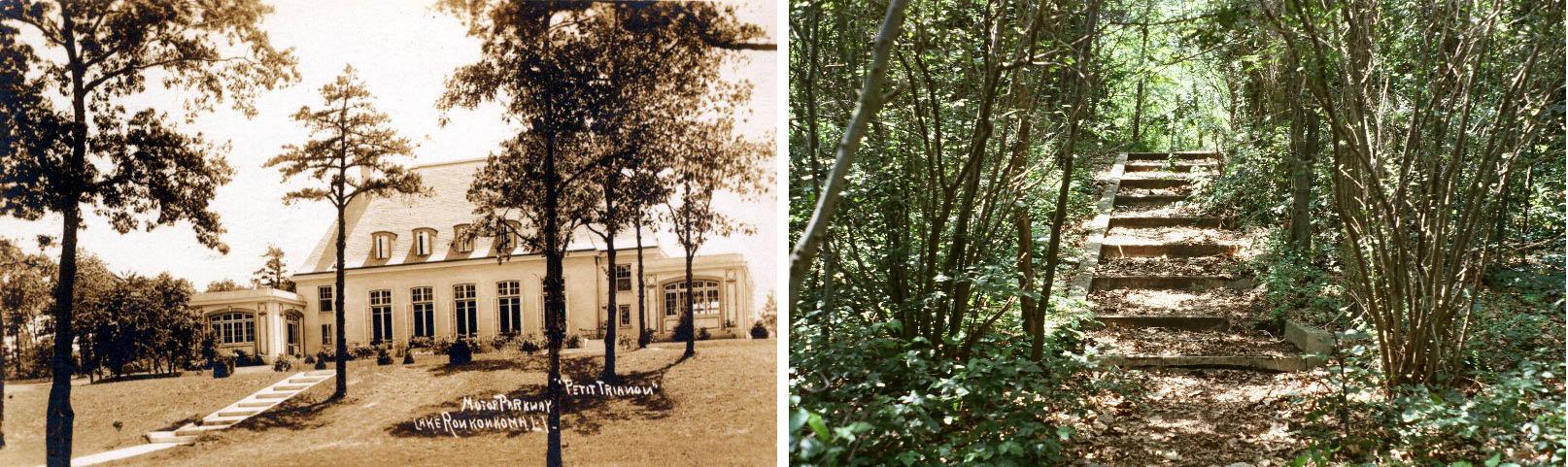 I visited the Petit Trianon many times in the 1940s and 1950s…inside and out. The stairs shown are not from this…and there were never any cement blocks used . The concrete walkway went directly from the rear of the Inn ...right into the lake when the water level was high…..no steps ever..and the trees shown are not on the site of the inn, near the beach.