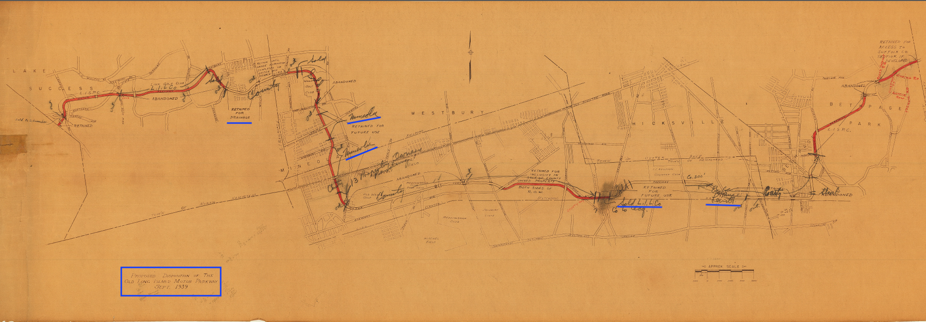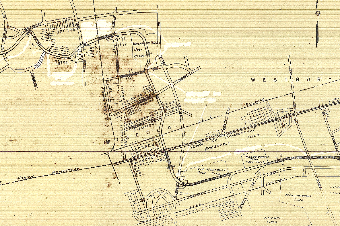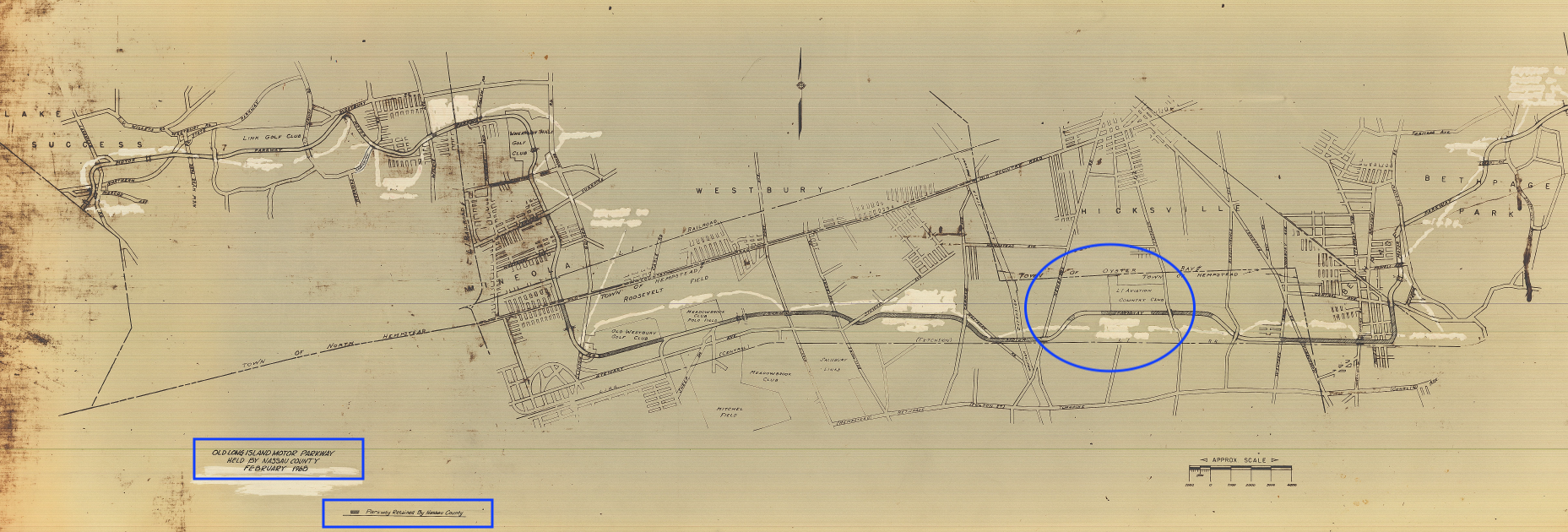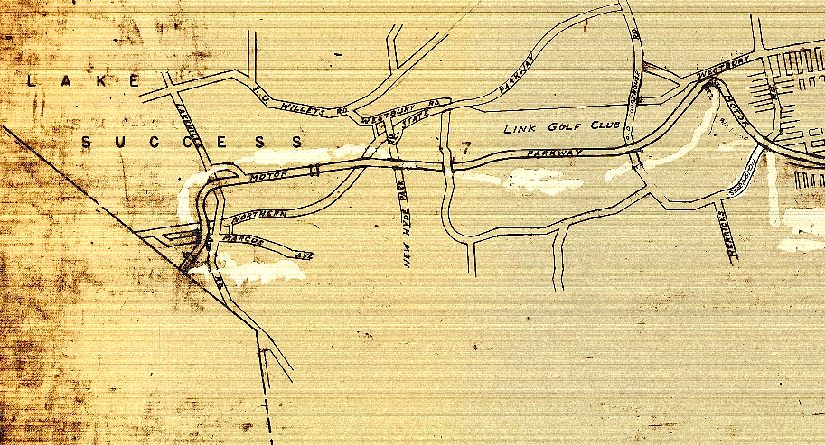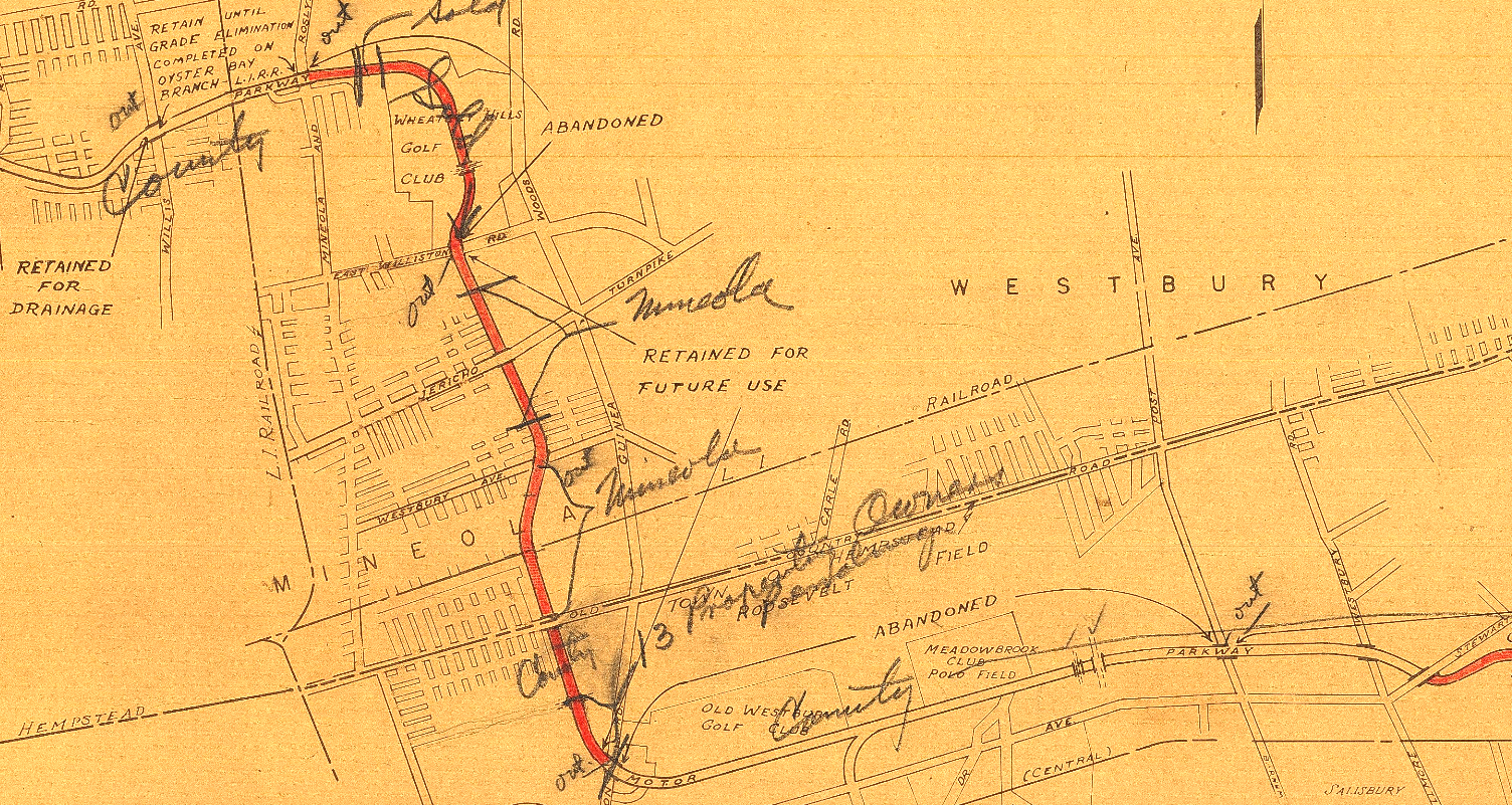 Some discrepancy here as the map is dated 1968 but the LI Aviation Club is still shown (it had ceased to operate two decades earlier) and Levittown does not appear to be developed yet. Also with what looks to be many areas whited out, it might be that an earlier map was used as the base map and that only the areas in grey on the Parkway roadway were added in 1968. (Credit: NCDPW)