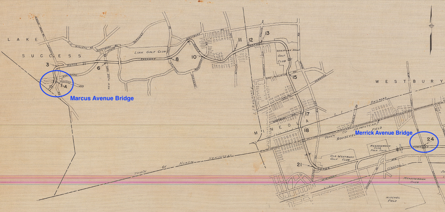 Nassau County took control of the Motor Parkway in the county in 1938 and began to determine what to do with the various parts it now owned as well as developing plans to remove the parkway's bridges. Over time most bridges were removed, however in the beginning not all were initially set to be removed - some were just going to get a new coat of paint and others were to remain untouched. With the assistance of the Nassau County Dept. of Public Works (NCDPW) documents are presented here that detail the removal of the bridges. This post is the first in a series and shows maps produced in 1938, 1939 and 1968. Future posts will highlight plans that were developed for specific bridges.