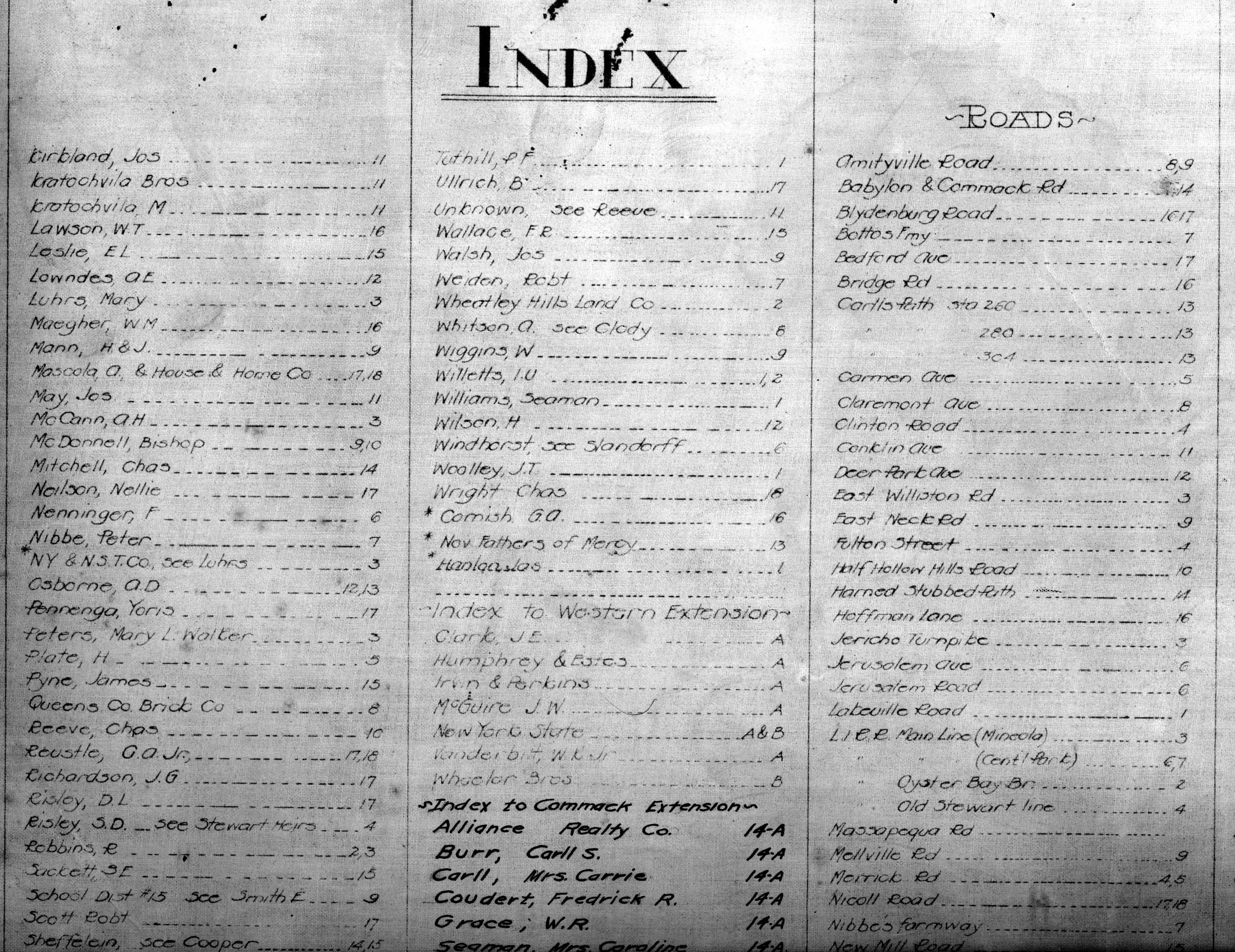 One of the treasures of my original Motor Parkway survey collection and a key to to the survey maps is a 48-page 1910 "Bookmap" documenting the right-of way, the original property owners, and the corresponding survey plan #s.The Bookmap details the entire 44-mile right-of-way from Fresh Meadows to Lake Ronkonkoma with surveyor notes added in 1929 and 1930.
