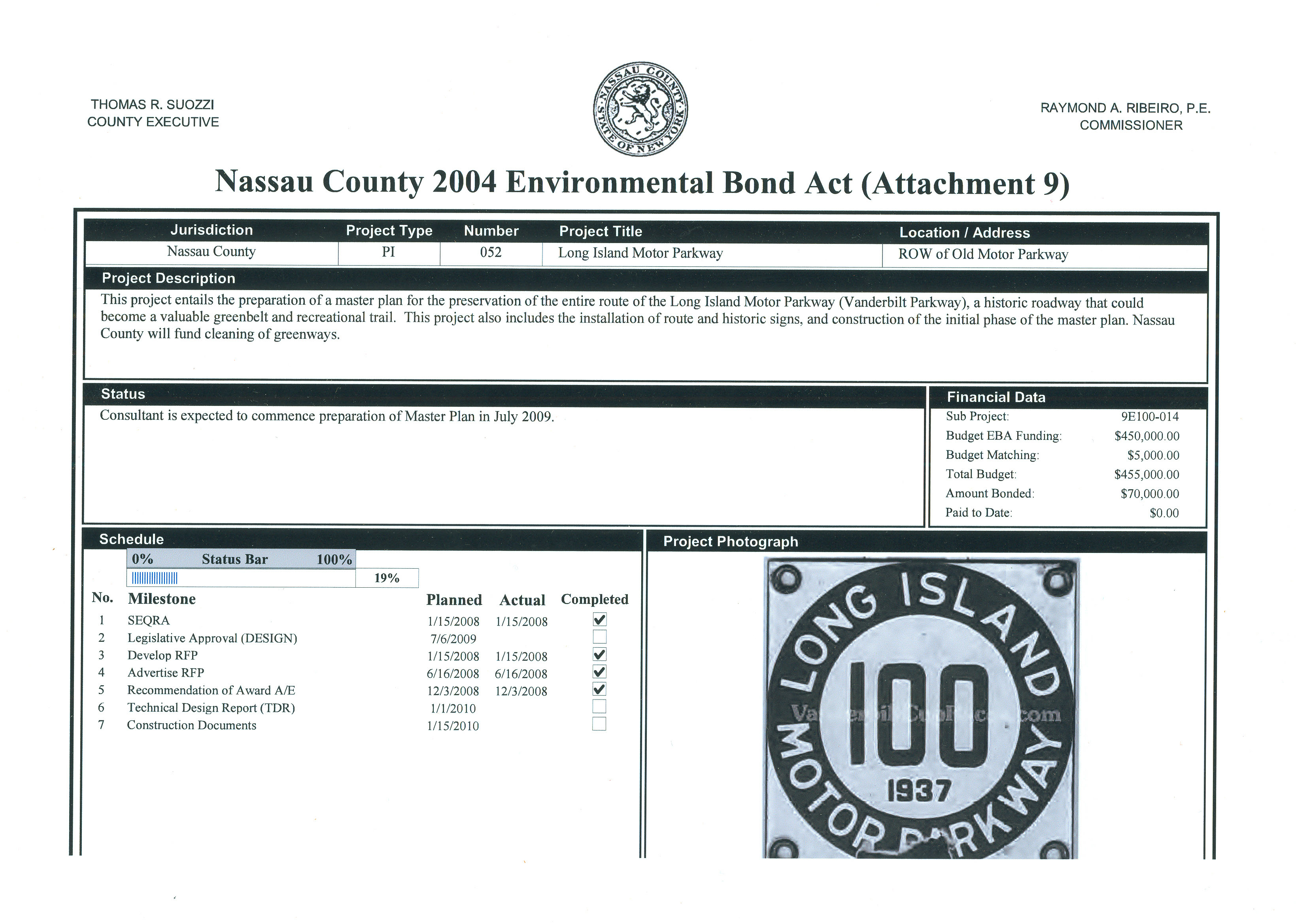 Last week, Nassau County published the current status of the bond projects. A consultant for the Long Island Motor Parkway Trailway project has been selected and is expected to begin preparation of a Master Plan this month with construction documents scheduled to be completed by January 15, 2010.