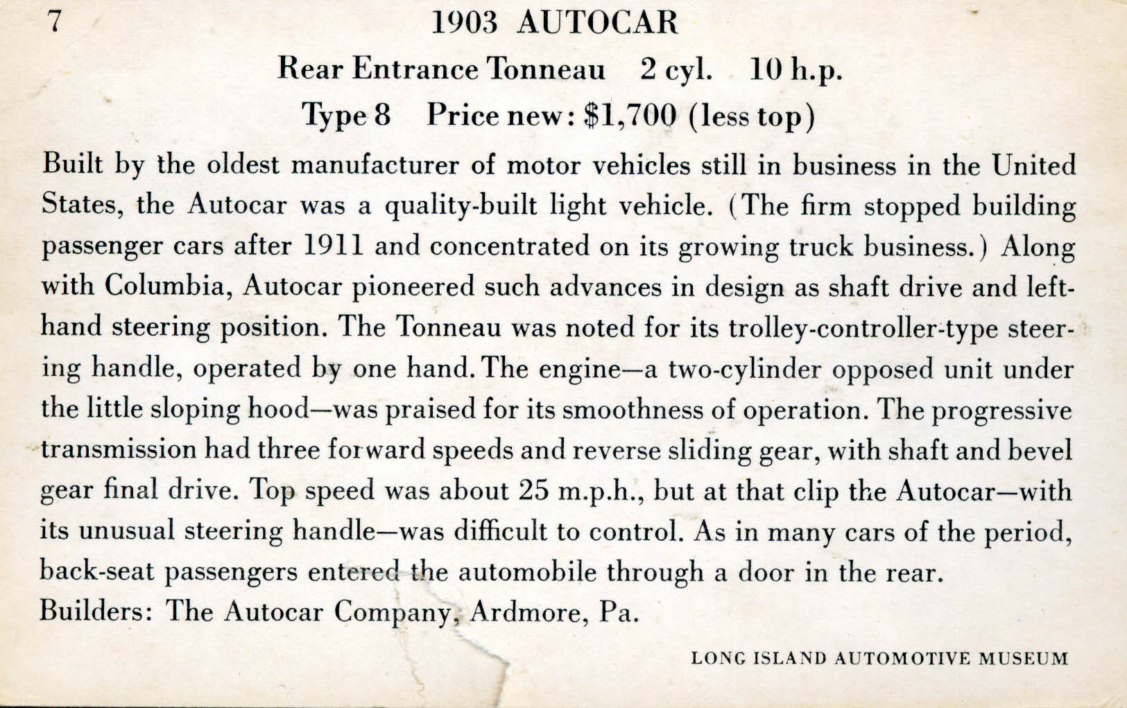 #7: 1903 Autocar, Type 8, 2 cylinders, 10 HP, Price new: $1,700 (less top)