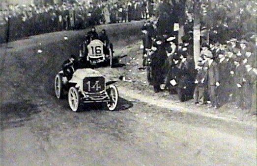 Undaunted, Chevrolet returned with 90-HP backup car in the Vanderbilt Cup Race. Here, he can be seen battling George Heath's Panhard at the New Hyde Park Turn on to Jericho Turnpike.