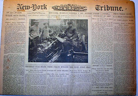 The New-York Tribune published the photo on its front page and declared "Chevrolet Near Death". Miraculously, he emerged with hardly a bruise.