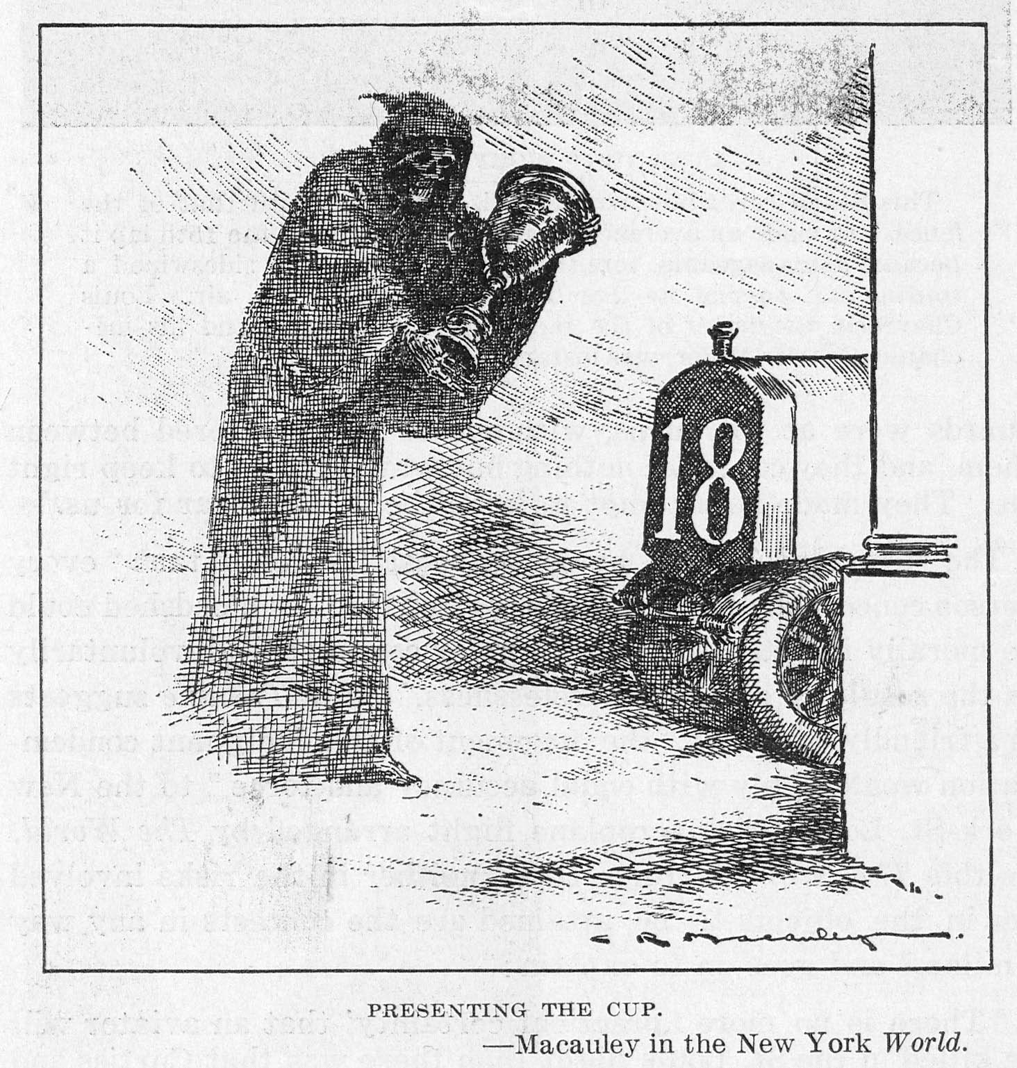 Two mechanicians were killed and several spectators were injured. In addition to Charles Miller, Chevrolet’s mechanician, Matthew Bacon, the mechanician for driver Harold Stone, was killed in a first lap accident when their Columbia car leaped over the Newbridge Avenue Bridge in East Meadow. Much of the press leveled criticism of reckless disregard for human safety at the race management.