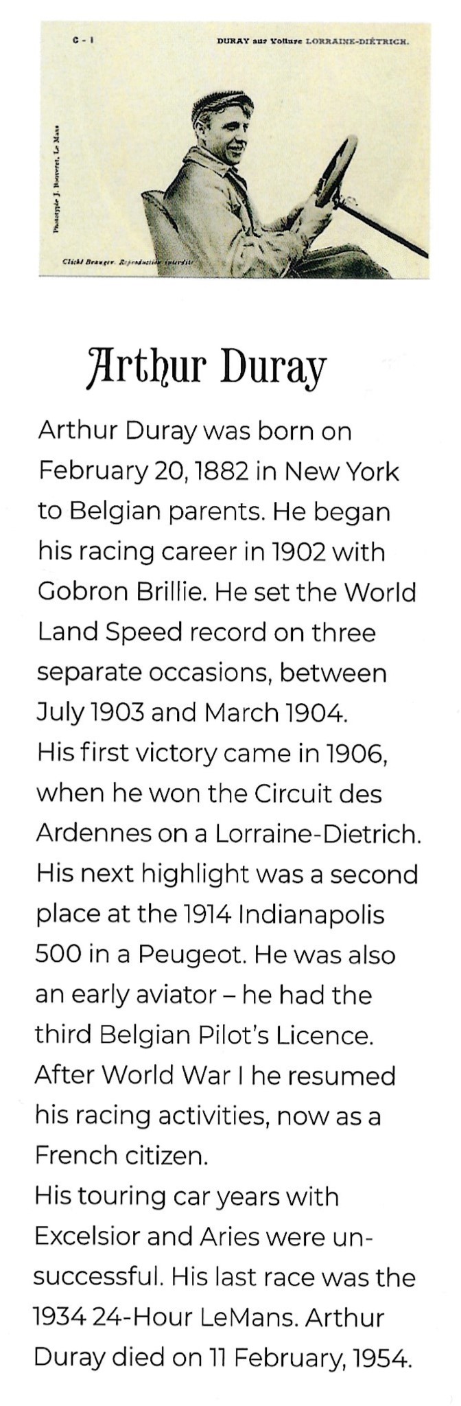 He fared much better in the Vanderbilt Cup finishing third in the 1906 Vanderbilt Cup Race in his #18 Lorraine-Dietrich and finished 9th in the 1905 Vanderbilt Cup Race in his #2 De Dietrich