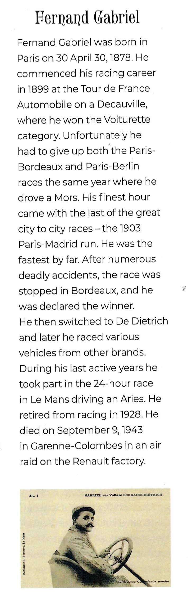 Gabriel and his Mors did not finish the Paris to Vienna race, but did better the next year as the unofficial winner of the 1903 Paris-Madrid Race. He raced the #2 De Dietrich in the 1904 Vanderbilt Cup race finishing 8th. He retired in Hicksville with broken pump and frozen carburetor during lap 7.