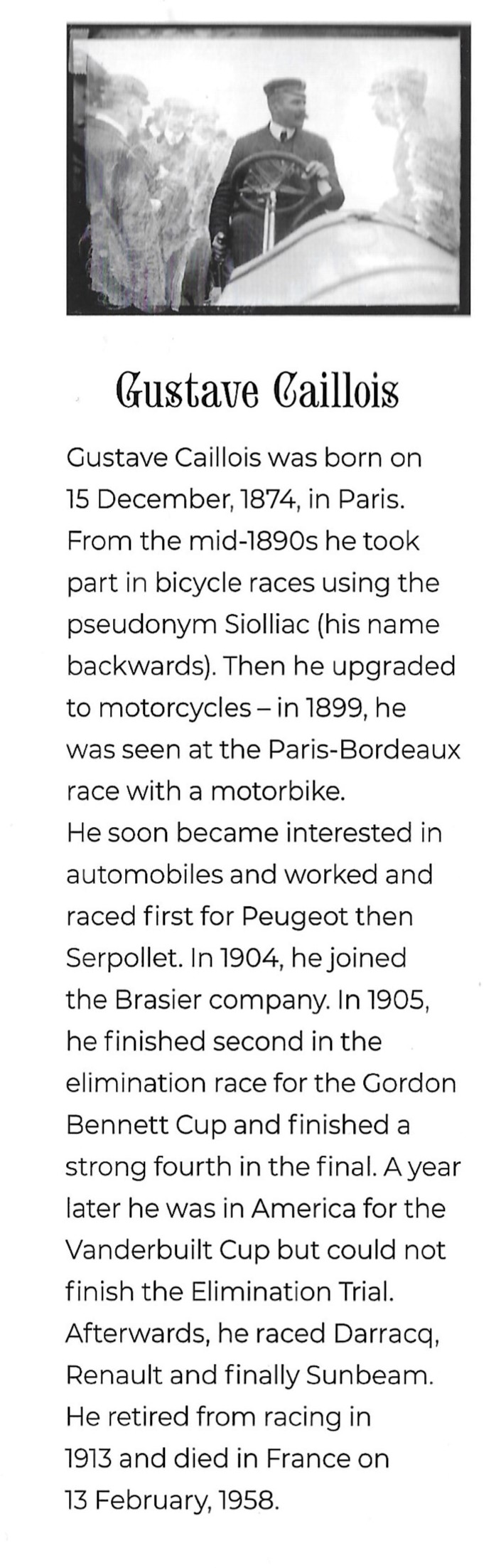 Callois worked in 1900 to 1901 as an engineer and designer for Peugeot, but despite his engineering pedigree, his racing Peugeot didn't make it to the end.