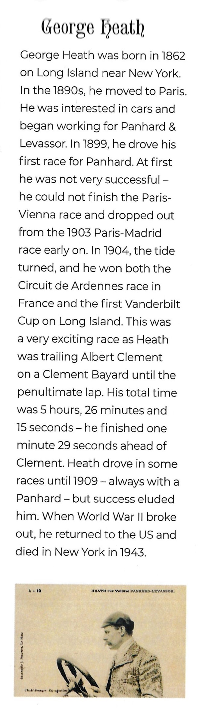 Two years later, he did use a family-made race car and did much better nabbing a #2 spot in the 1904 Vanderbilt Cup Race with the #12 Clement-Bayard finishing only 1 minute and 28 seconds behind winner George Heath in 1904 race.