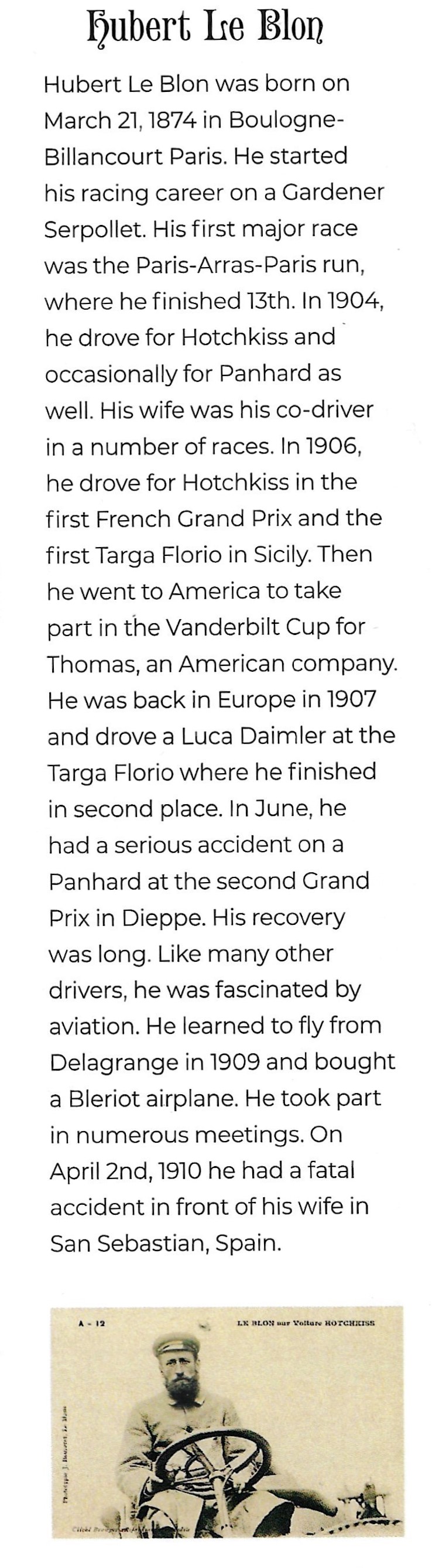 The American Thomas Motor Company hired two Frenchmen to drive their entries in the 1906 Vanderbilt American Elimination Trial with teammate Gustave Caillois. Le Blon finished a strong second and qualified for the American Team in the #6 Thomas.