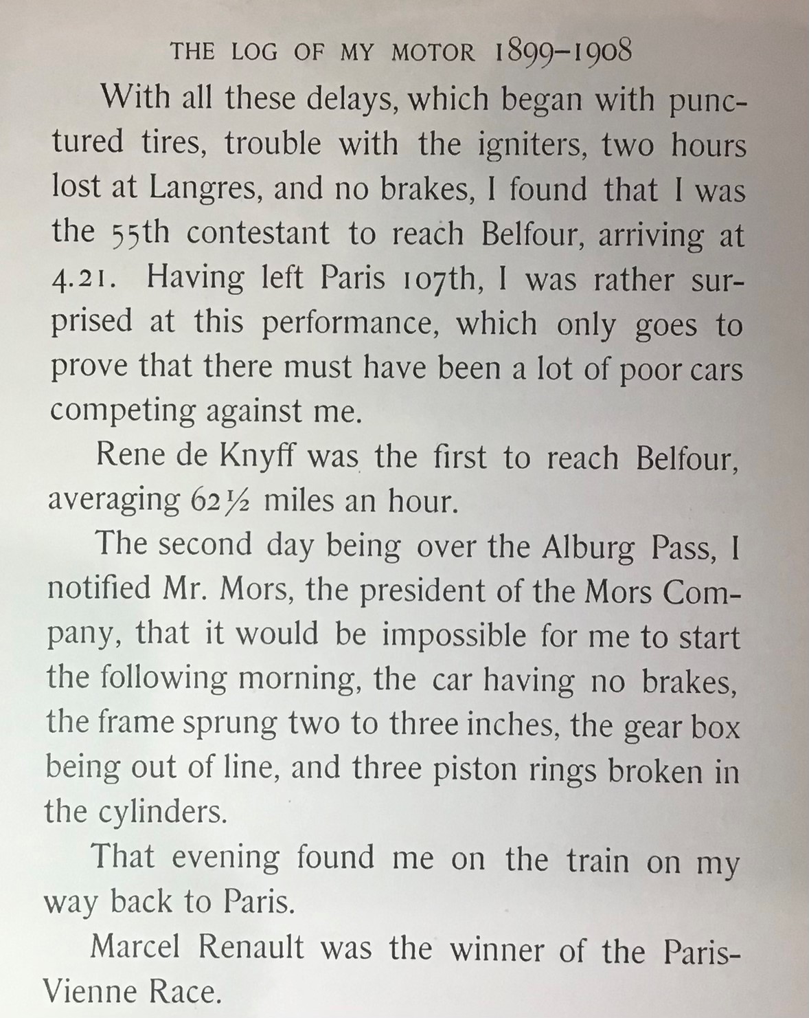 The 1902 Paris to Vienna race and Willie K's trials and tribulations in the race were chronicled in his book, 'The Log of my Motor 1899-1908'.