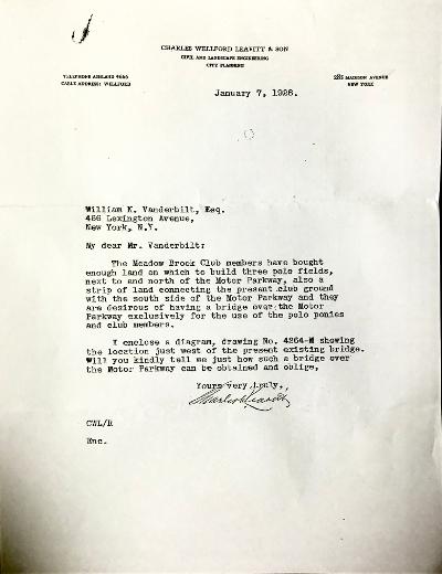 In 1926 the Meadowbrook Country Club acquired land adjacent to the Motor parkway on the North side and had planned for 3 new polo fields.. Their club, located on the south side of the parkway, would be in need of a dedicated bridge directly on the west side of the then current Roosevelt Field bridge to connect the new polo fields to their south side property.