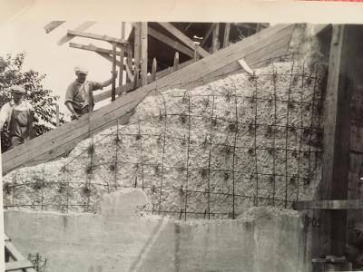Originally thought to be a photo during construction, further examination points to this being more likely during demolition. Exposed steel reinforcement seen as the abutments were removed in layers.
