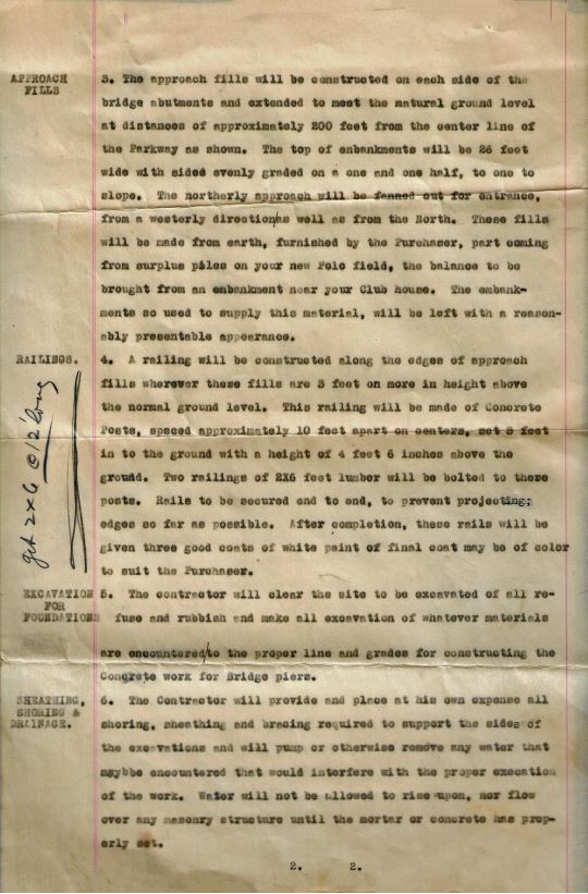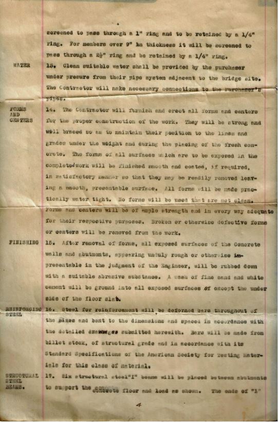 The following are the details that went along with the bridge plans to describe construction, materials and labor for bridge construction.