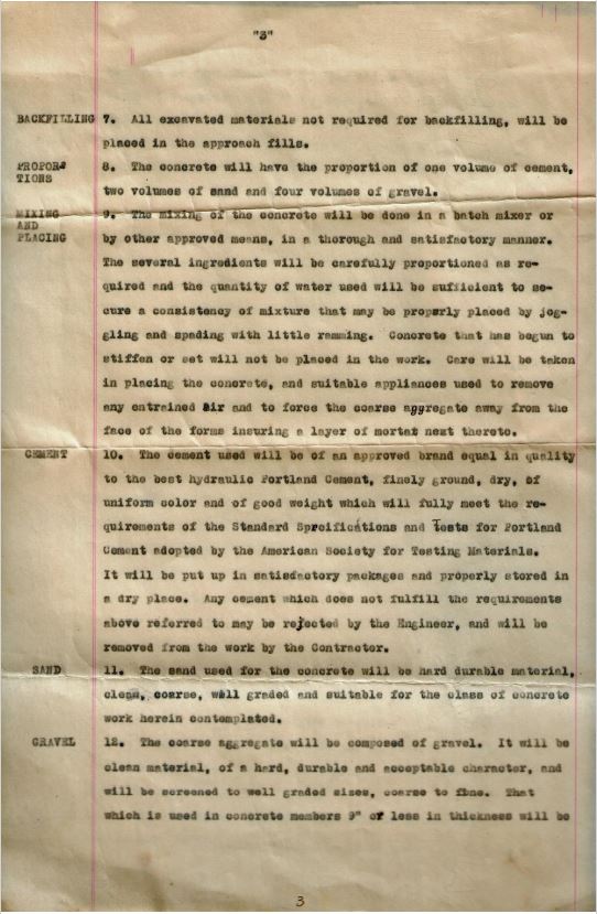 Page 3 details concrete mixing proportions "1 volume cement, 2 volumes of sand, and 4 volumes of gravel." Careful attention was made to the cement consistency and making sure coarse aggregate was away from the face of the forms. Equal attention to the quality of the Portland cement, sand and gravel was also paramount. Reading these plans it becomes clear why these bridges were difficult to remove when they finally came down.