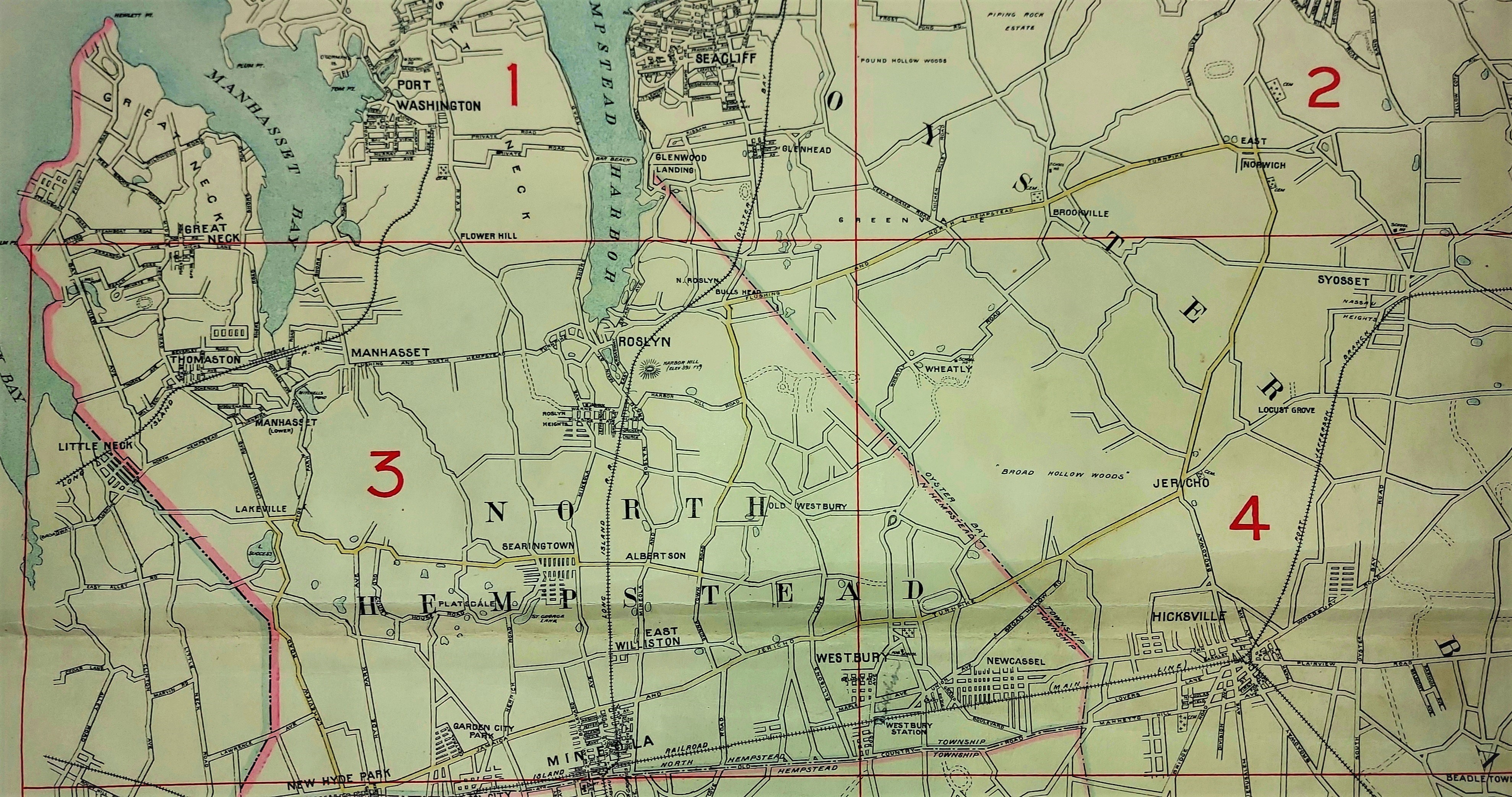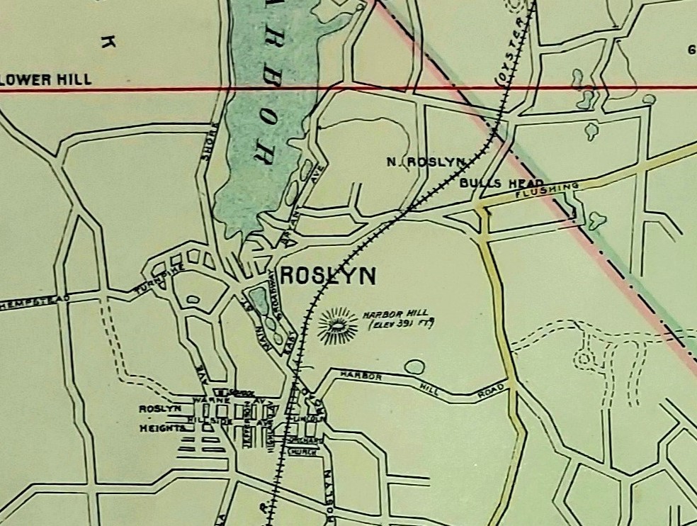 A closer look at the Roslyn area that shows the famously tough Bull's Head turn and hotel, as well as Harbor Hill where Clarence Mackay's Harbor Hill estate, (built from 1900 through 1902), was located.